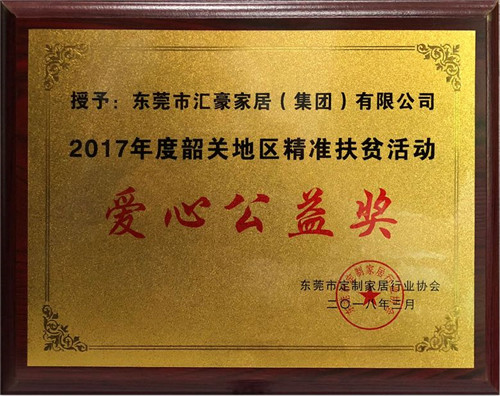 同时,汇豪家居还获得了一项特殊的荣誉——2017年度韶关地区精准扶贫活动“爱心公益奖”,向社会展示了汇豪家居不仅仅是一个优秀的定制企业,更是一个具有爱心和社会责任感的企业。