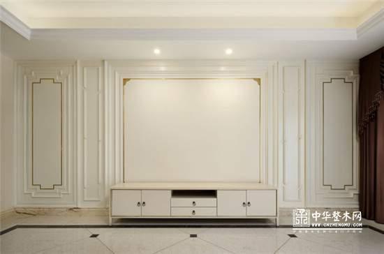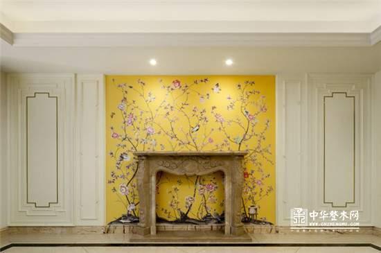 本案特色在于客厅,以白色为主色调,再配以温宛的花鸟字画赋予了空间清新纯净温馨的氛围,墙身的护墙板采用金属条和雕花喷金的效果,让空间增加了些许质感,白色的壁炉,优雅的硬装诠释了高贵的气质。