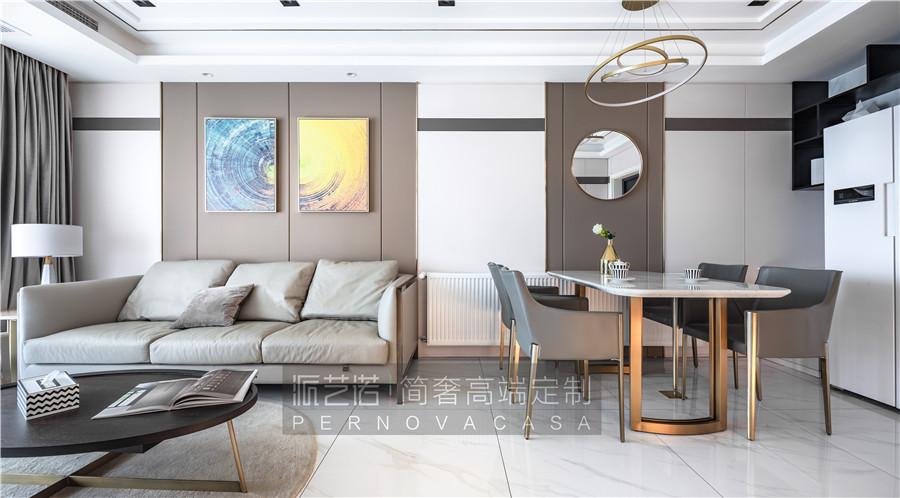 ▲客厅、餐厅、厨房等区域开放连接,而整个空间以米/咖/灰/金的配色,运用极富质感的定制护墙板和硬包材质,点缀极具线条张力的金属线条,渲染出一种低调的奢华感。
