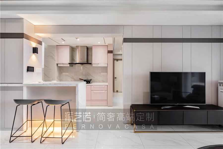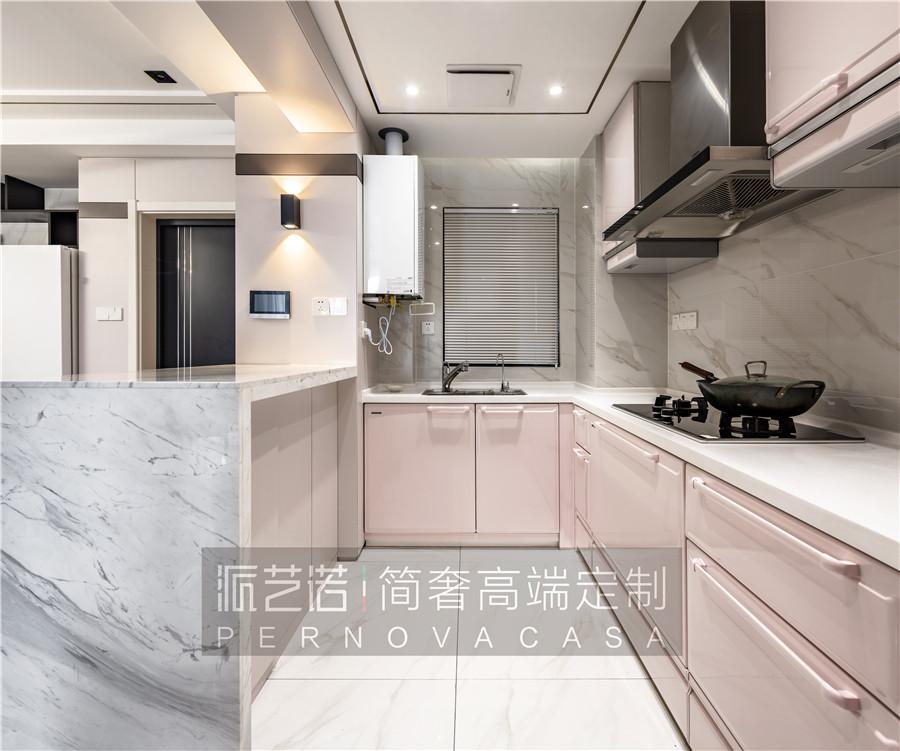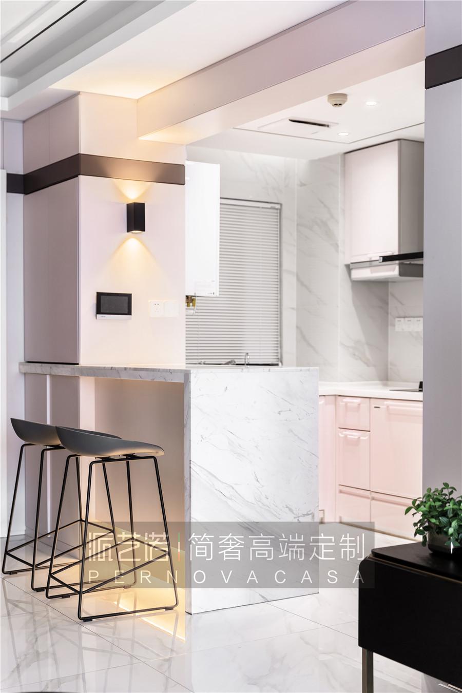 ▲开放式厨房营造出开阔大气的视觉感。大理石吧台和粉色中岛柜巧妙融合,使得空间丰富且温馨。当一家人围坐在一起,伴随着烟火气的爱意蔓延开来。