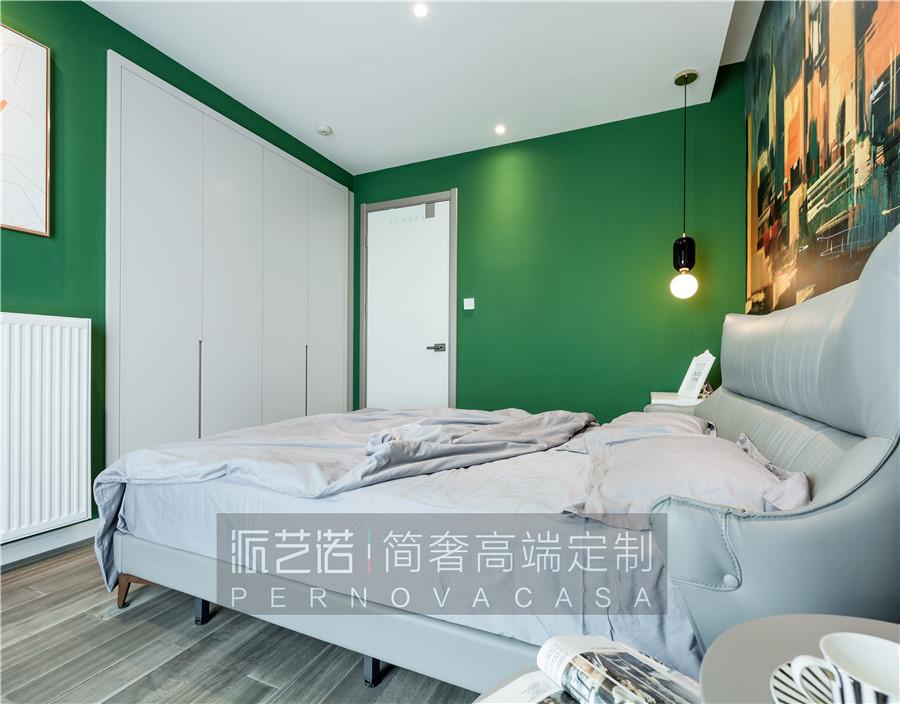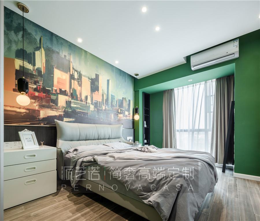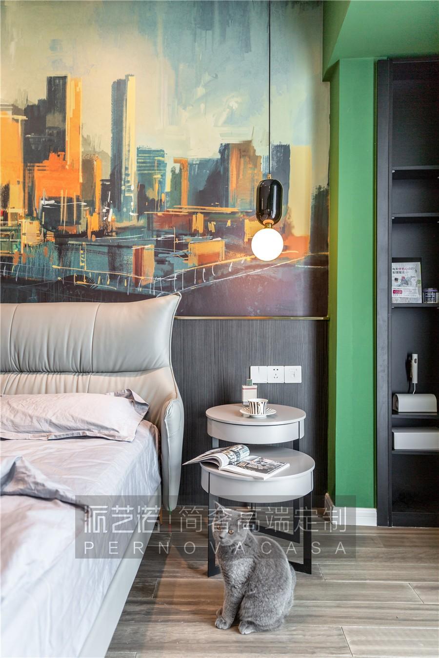 ▲充满生命力的卧室空间里,床头背景采用半高的木纹墙板、点缀精致的金属线条,恰到好处的营造细节的品质感。