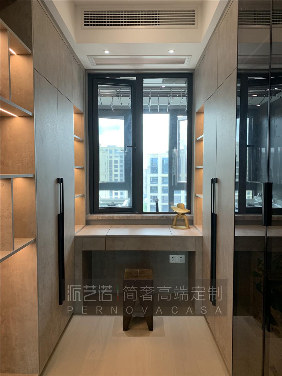 衣帽间采用高品质定制家具、简约的线条,配上精致的拉手,气质尤为出众。收纳分区,物品的归类使主人有序存放,不显凌乱。开门设计使空间统一,整洁大气。