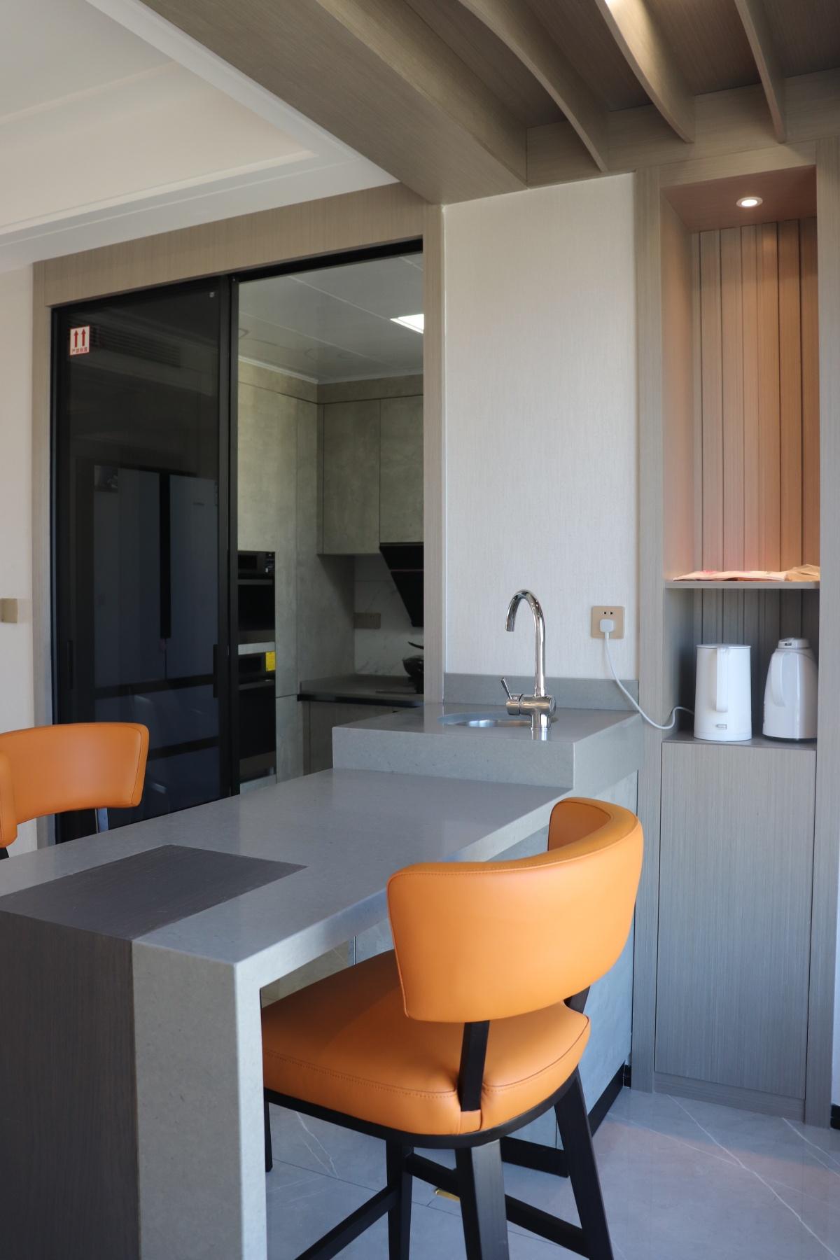 ➯延续了客厅的整体效果,同时又展现出自己的新意,水吧台与衔接而成,这块区域不仅用于就餐,平时也可以在此用电脑办公,餐桌岛台一体。
