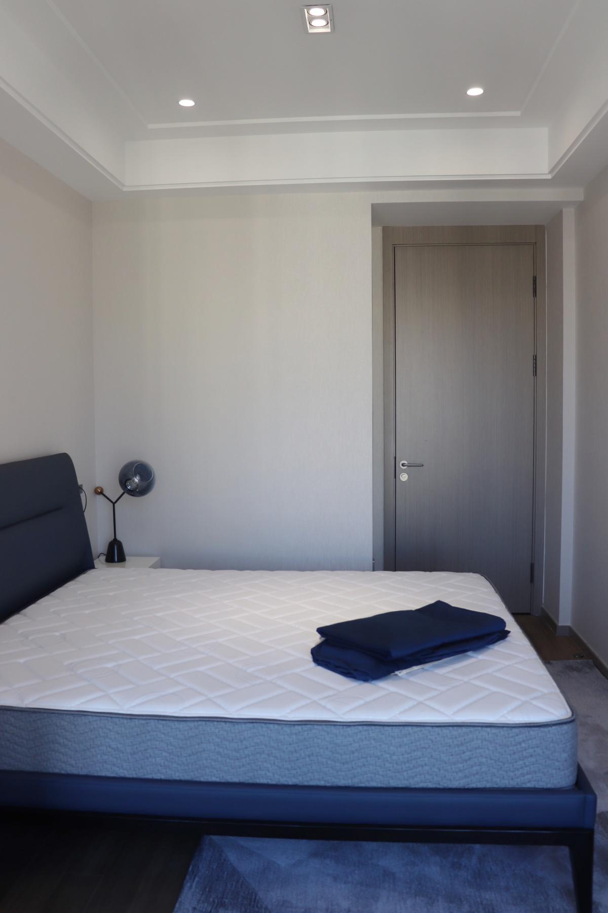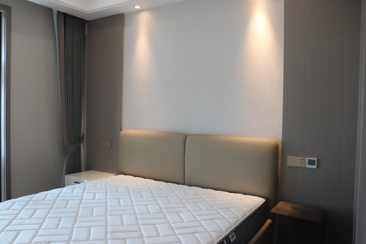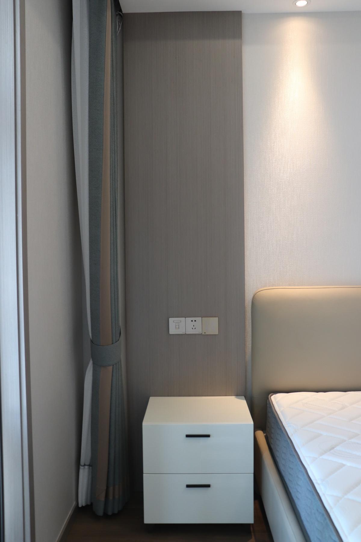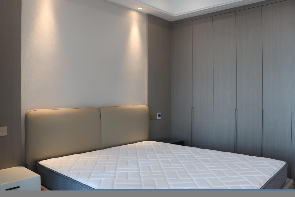 ➯银梨本色木饰面搭配米色床靠背,塑造了卧室空间低调柔和的质感,床背景顶面配上精致的灯光打破了空间的沉闷,与整体的灰白渐变风格相呼应。