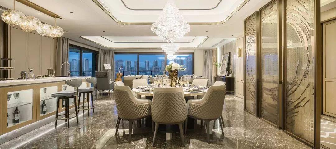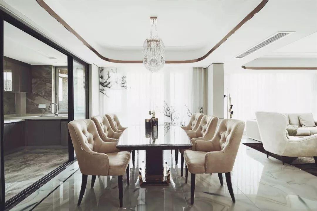倾泻而下的吊灯,双侧定制的木作餐边柜及护墙板,玻璃与金属相撞的轻奢感,不露声色的在空间流转,在彰显自身优美的同时,力求在线条、比例设计上充分展现丰富的艺术气息。