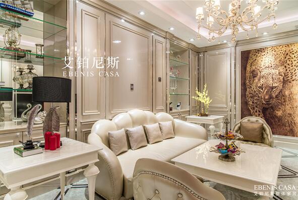 艾铂尼斯整体家居定制珍珠贝母漆墙板 珍珠贝母漆大面积的使用,让家居空间在整体上更加华贵典雅,墙板在灯光下影影绰绰,营造了一种轻奢时尚的氛围。