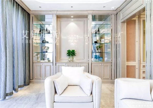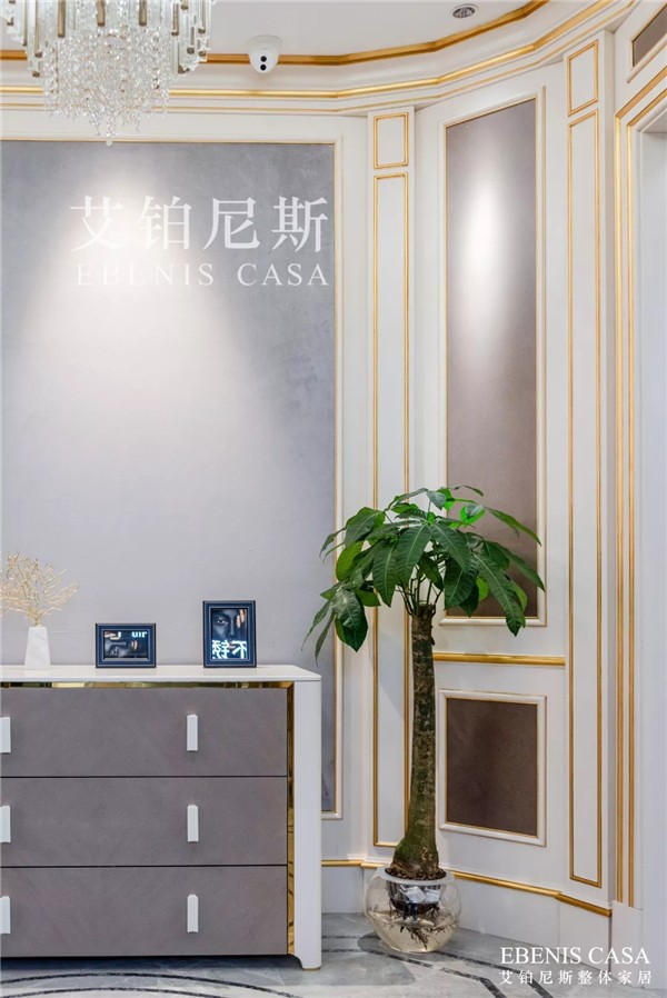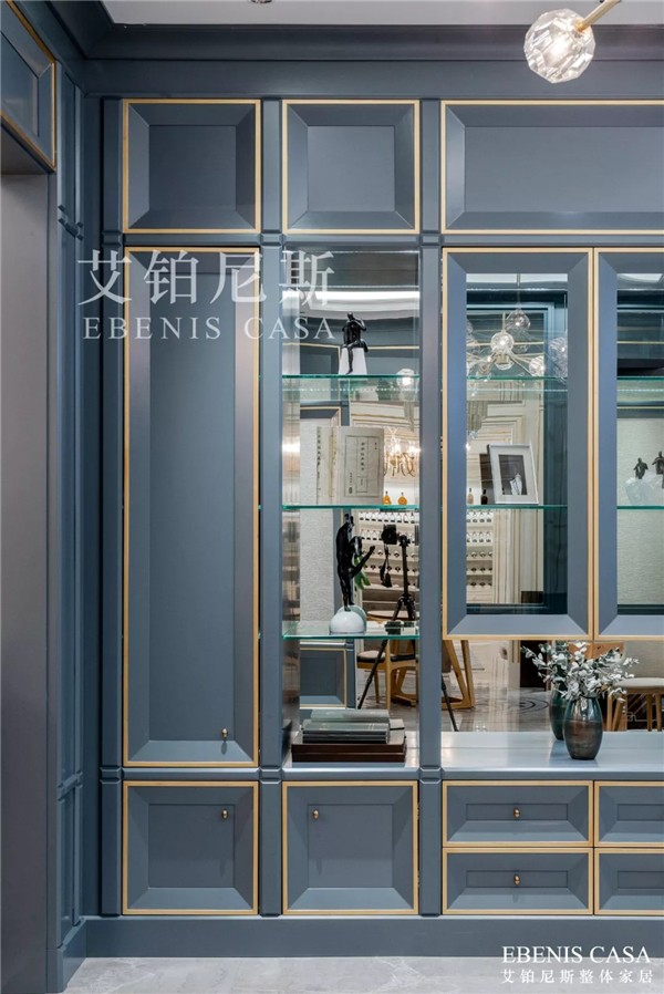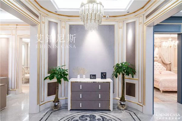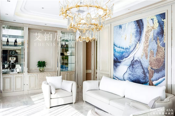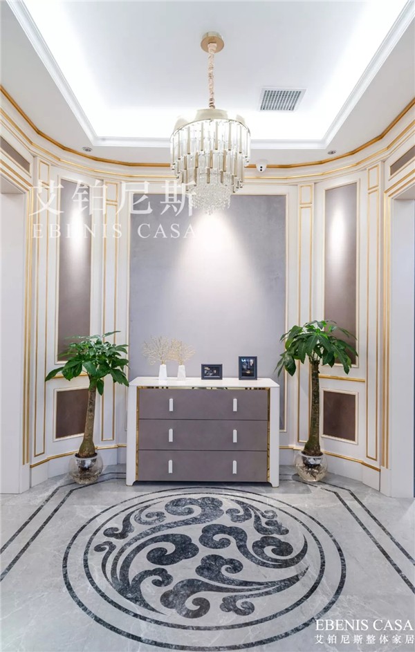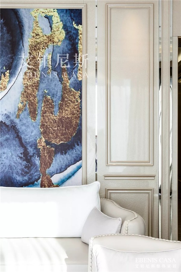这款简欧风格的圆厅,金色在整个空间中的运用十分亮眼,使用24k金箔在墙板上手工拼贴出不同比例的金色线条,白色的单调融合金色的华丽,提升空间的品质感。墙板部分使用了灰蓝色和棕色,与白色形成对比反差。搭配同色混搭的家具,打造和谐统一的空间氛围。