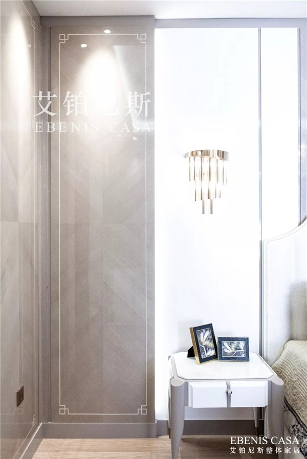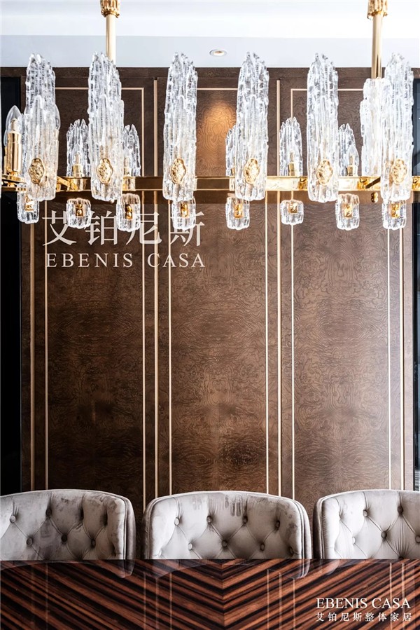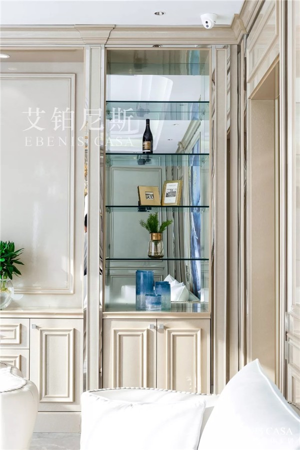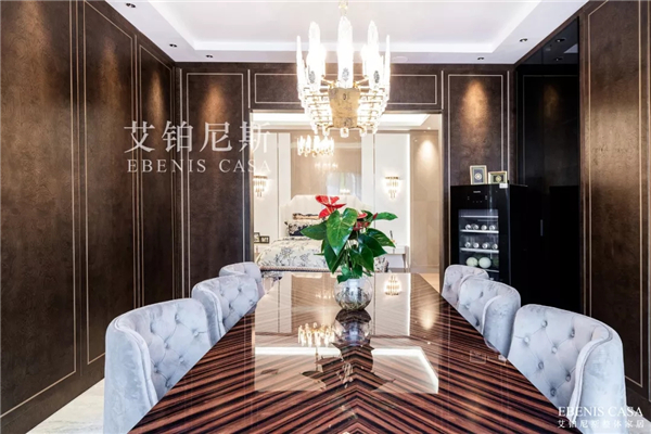 珍珠贝母漆这种特殊的工艺漆后的效果表面光滑,手感细腻,既有彩虹般的立体感,又散发珍珠的迷人光泽,在光线照耀下下熠熠生辉,营造奢华优雅的空间氛围,而镜面金属线条的使用,又添加了几分现代时尚感。