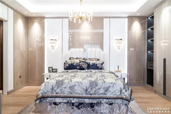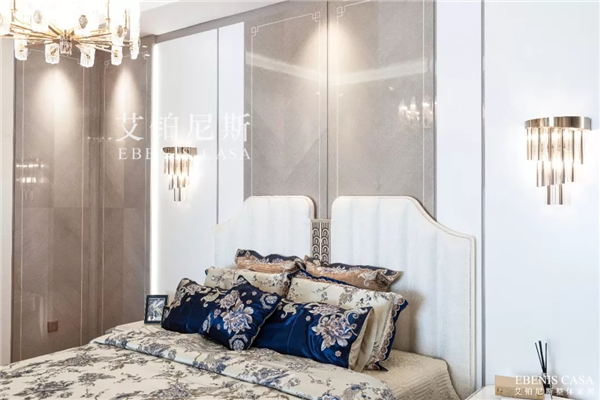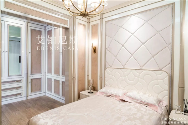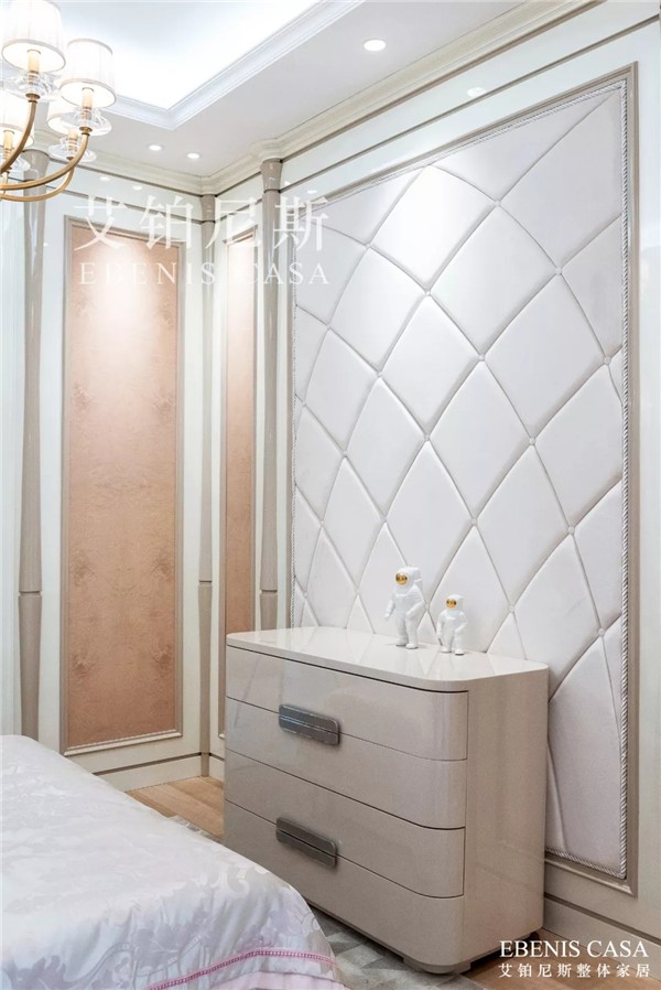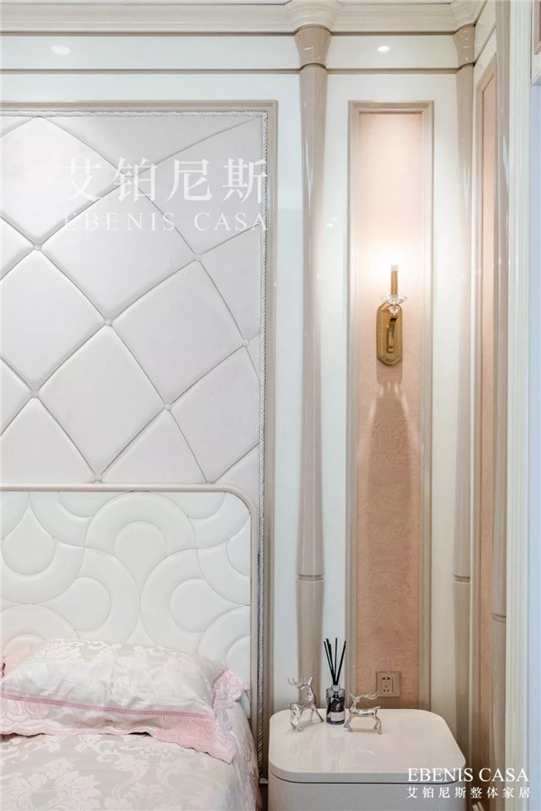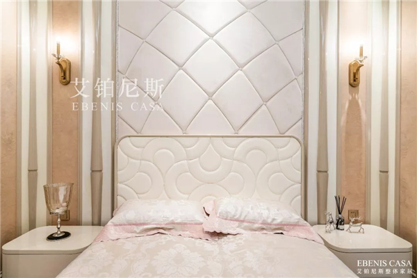 这款卧室空间将弧线与直线相融相和,略带弧度的立柱线条犹如女士婀娜的身躯,大面积白色带有弧度的菱形软包设计,打造柔和曲线美,深浅层叠的浪漫粉色搭配纯洁的白色,打造优雅卧室氛围。