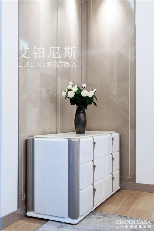 浅色云影系列,清雅的配色,时尚现代的高亮光漆打造犹如清水般的透明质感,薄木拼贴的回形纹又融入一丝中式雅韵。