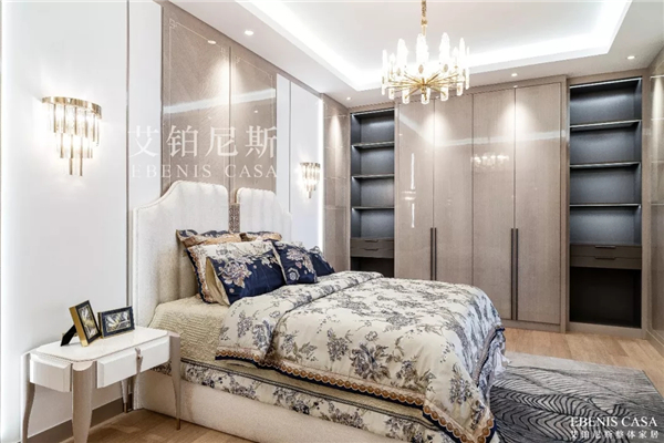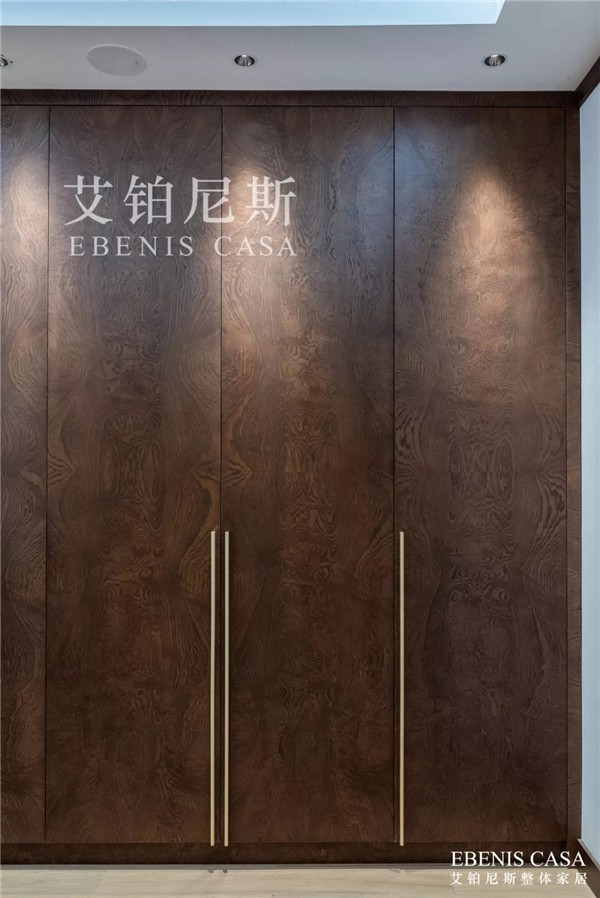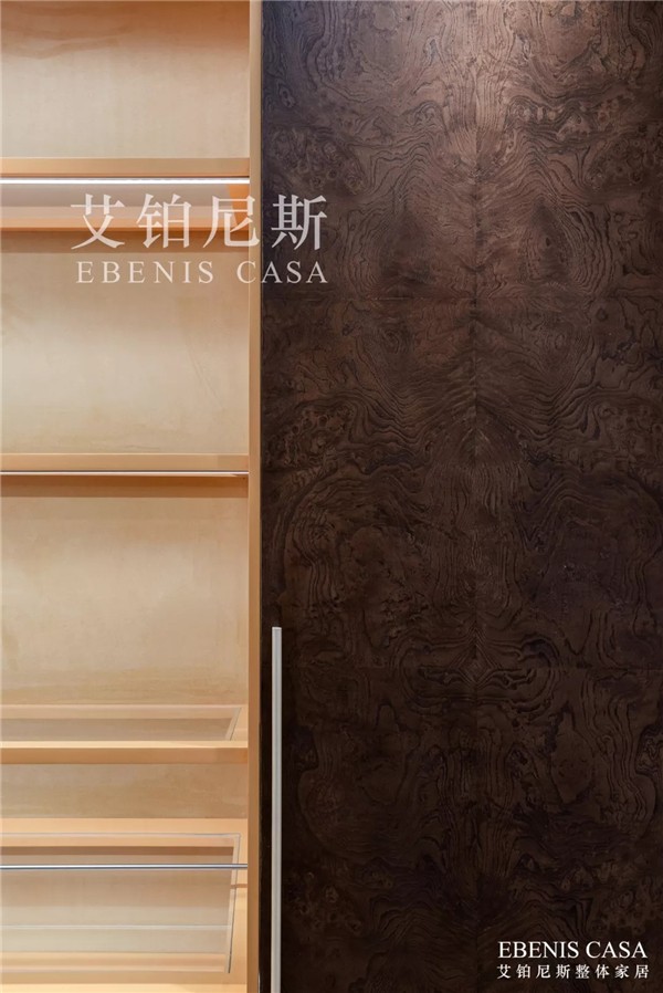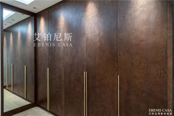 极简风格的衣帽间,款式简约,也颇受人们喜爱。柜门同样使用珍贵的花樟旋纹木皮,而特殊的半开放油漆效果,让木皮本身的纹理更好的展现,打造低调的奢华。