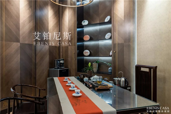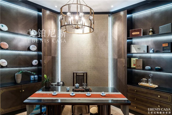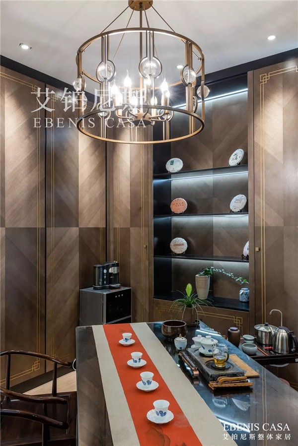 现代中式风格的茶室,运用不同深浅色的木皮进行十字拼贴,巧妙使用自然的纹理和颜色,打造古典韵味。双回形纹的金属纹饰,让中式风韵更浓厚,静坐于此,品一壶香茗,乃人生乐事也。
