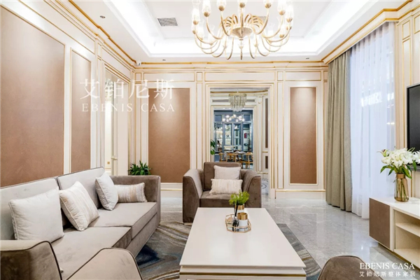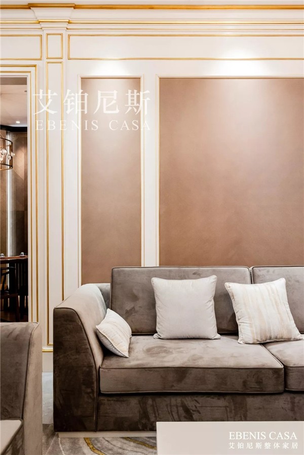 同样是使用金箔工艺的空间,这款简欧风格的客厅,使用大面积棕色木皮并且做了半透明的油漆效果,中和白色的轻和金色的艳,让空间沉稳下来,感官上更舒适。