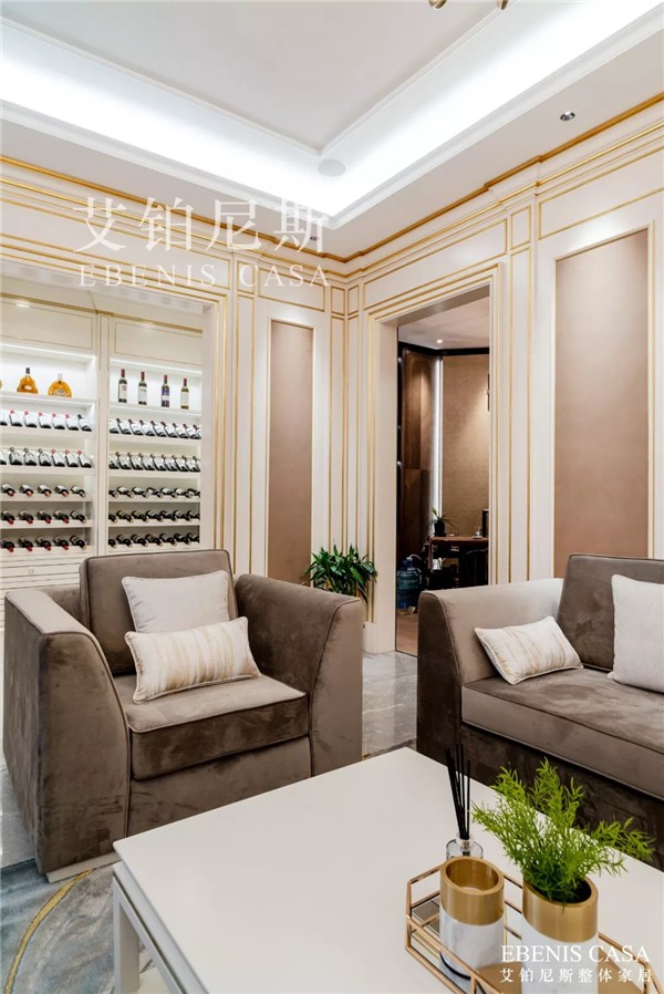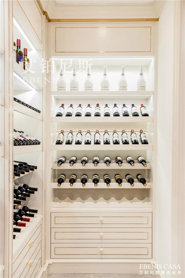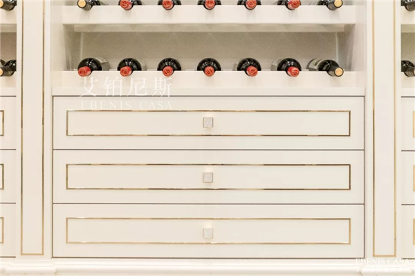 这款简欧风格的酒柜使用纯白色的主基调,摒弃繁杂的装饰,比例均匀简洁,宛若一位白衣胜雪的翩翩公子;金色金属线条的使用,为纯白的空间增添一丝贵气,与白色辉映相融,打造现代时尚空间。