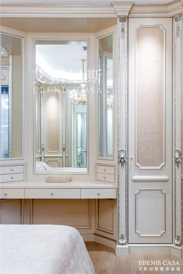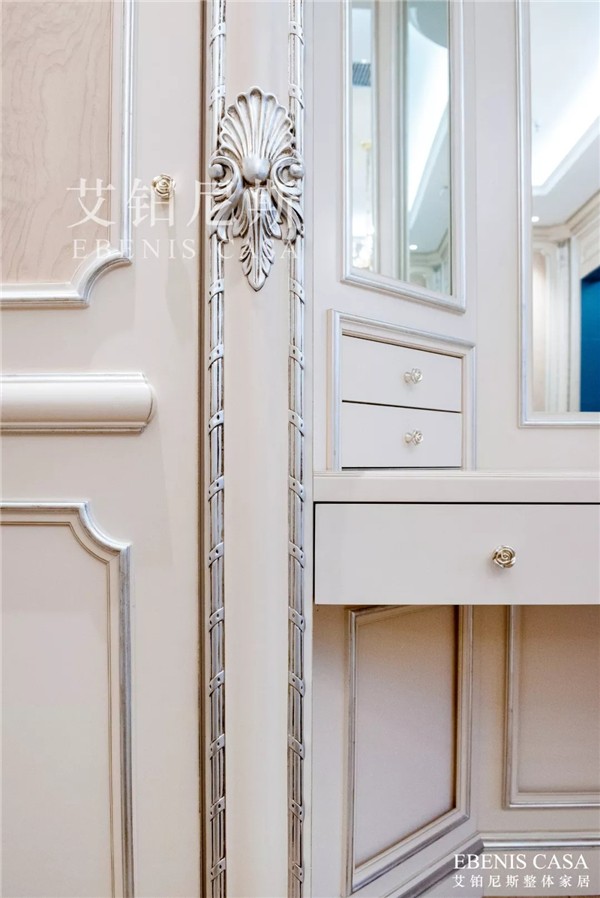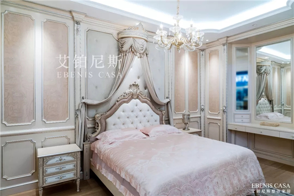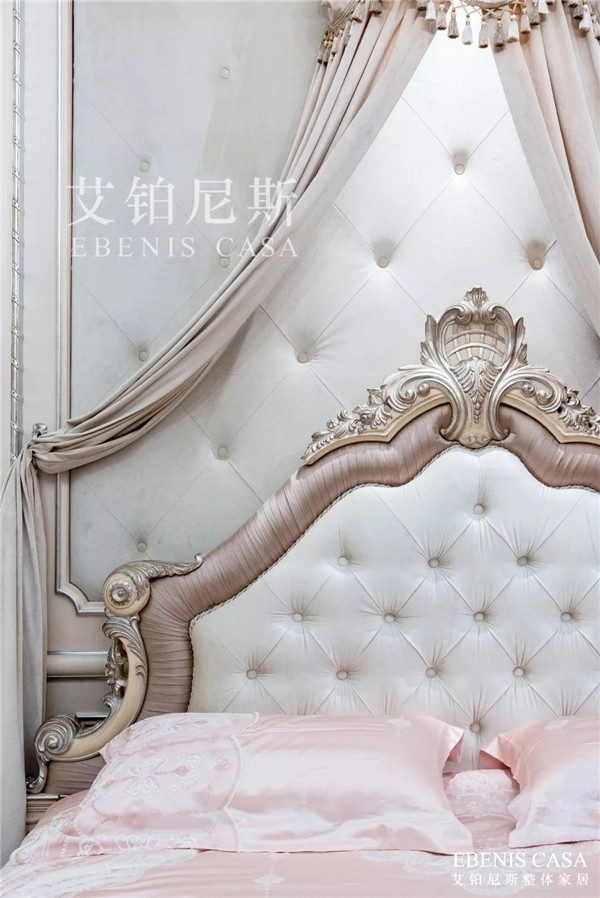 浪漫的塞纳系列,打造梦幻公主房。肉粉色系的木皮采用半透明油漆保留了木皮的天然纹理,淡雅柔和。每一处雕花装饰都十分用心,手工雕花和手工贴银箔做旧的工艺,让雕花自然灵动,充满优雅精致的感觉。
