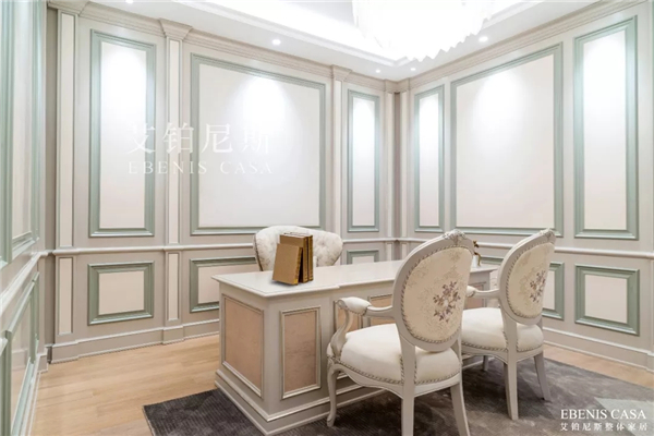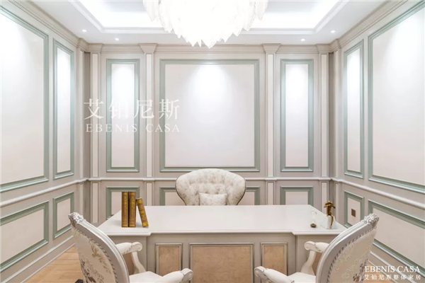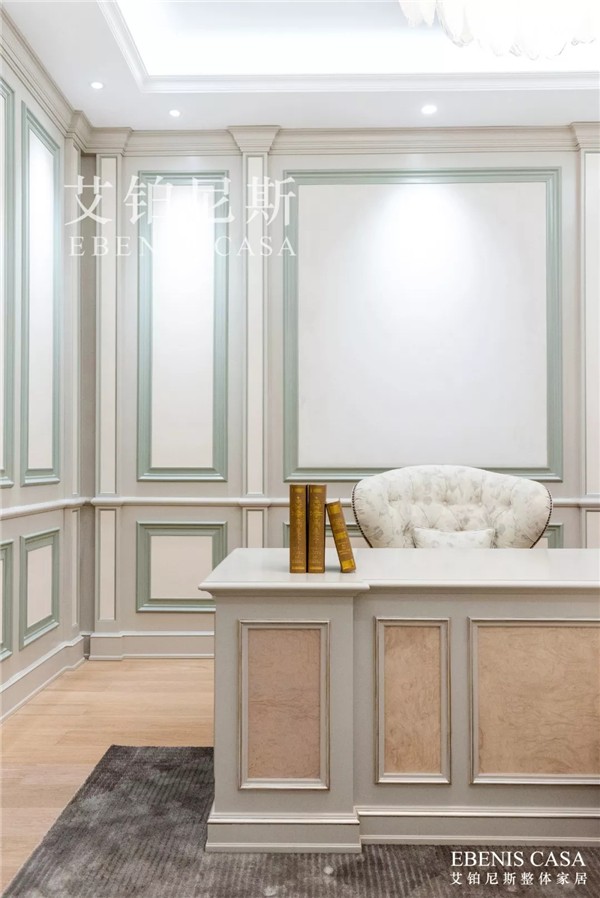 这款书房使用浅灰色、白色搭配灰绿色的混油套色,清新的配色,打造明快舒适的空间氛围;墙板设计比例干净简洁,让空间挺拔明亮,搭配简单的罗马立柱,增添一丝优雅和浪漫。