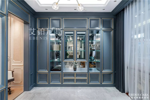 和鸣系列是一个简欧风格的“异类”,放弃清新明快的配色,转而大面积使用灰蓝色,再搭配金色的质感,配色大胆又亮眼。墙板内凹的坡度设计的更为宽大,让整个空间更具设计感。