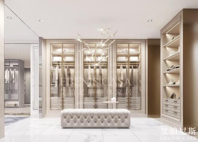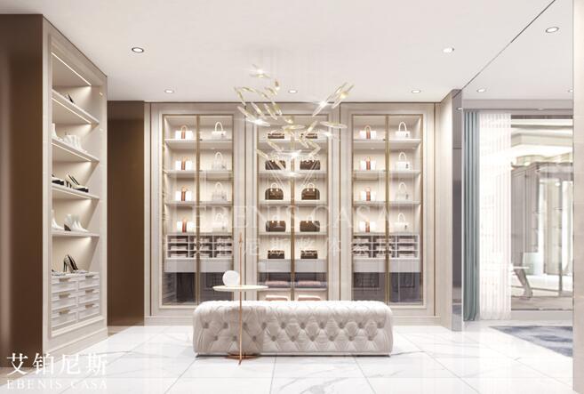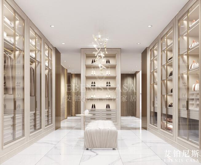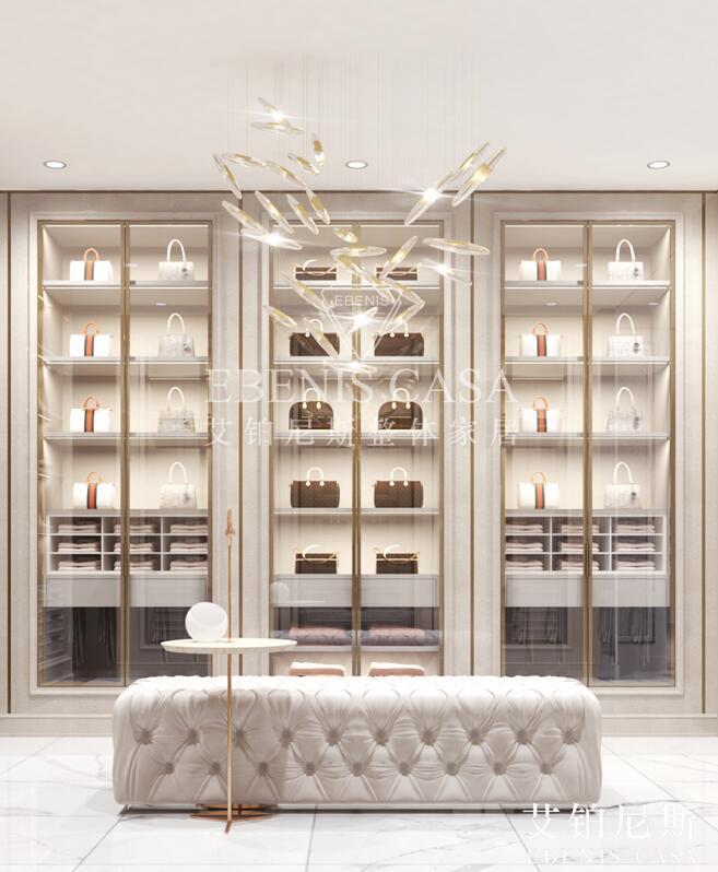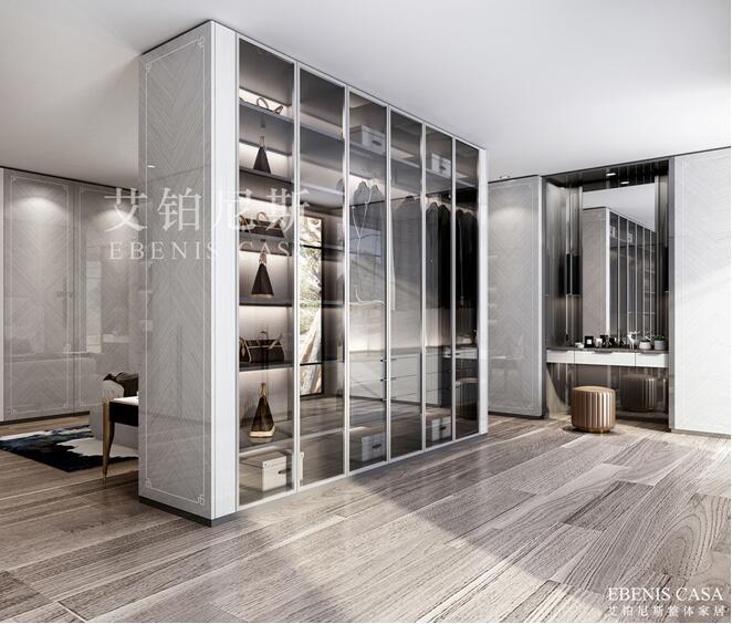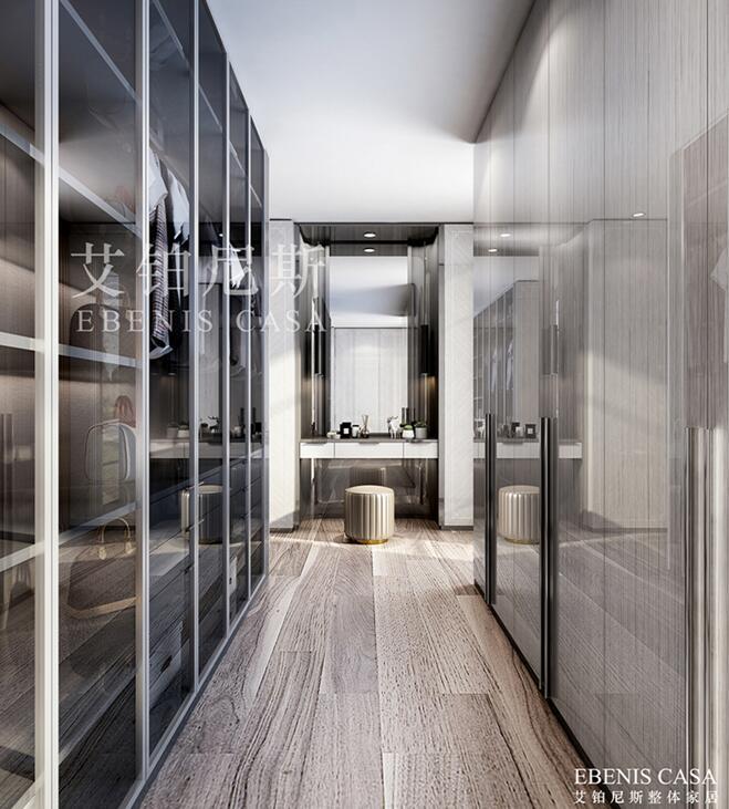同款衣帽间设计,配合玻璃柜门带来强烈的时尚感。