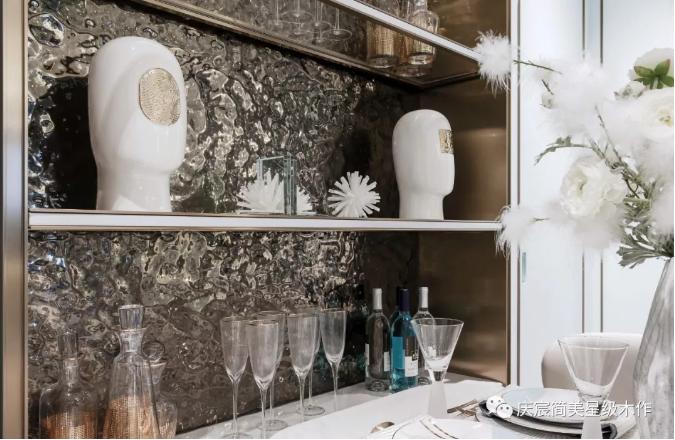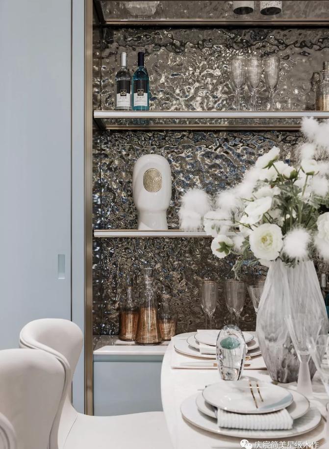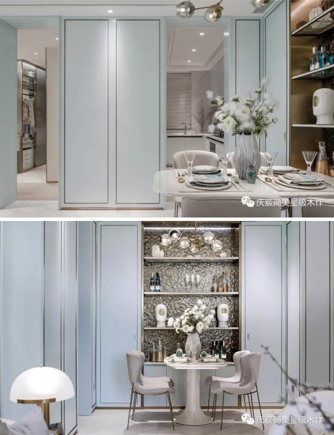 餐厅同样采取蒂芙尼蓝为主体色,金属质感的壁柜扩大储物可能性。色彩承载的真正意义,是平凡生活中的惊喜,是对幸福生活的向往。在精致餐具的烘托下,诺人放慢脚步,与家人同享浪漫的用餐时光。杯盏间深情浅笑,微醺时促膝长谈,无关风雨,乐享当下。