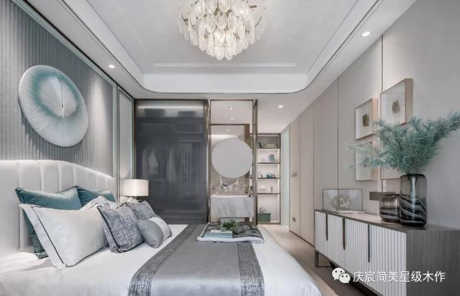 独立的洗手台面和悬吊的艺术挂镜,无一不彰显独家定制的私享品质感。艺术空间给予了人们对生活的美好向往。未来家庭生活的憧憬让整个主卧空间浸润在蓝宝石般的幸福感之中。
