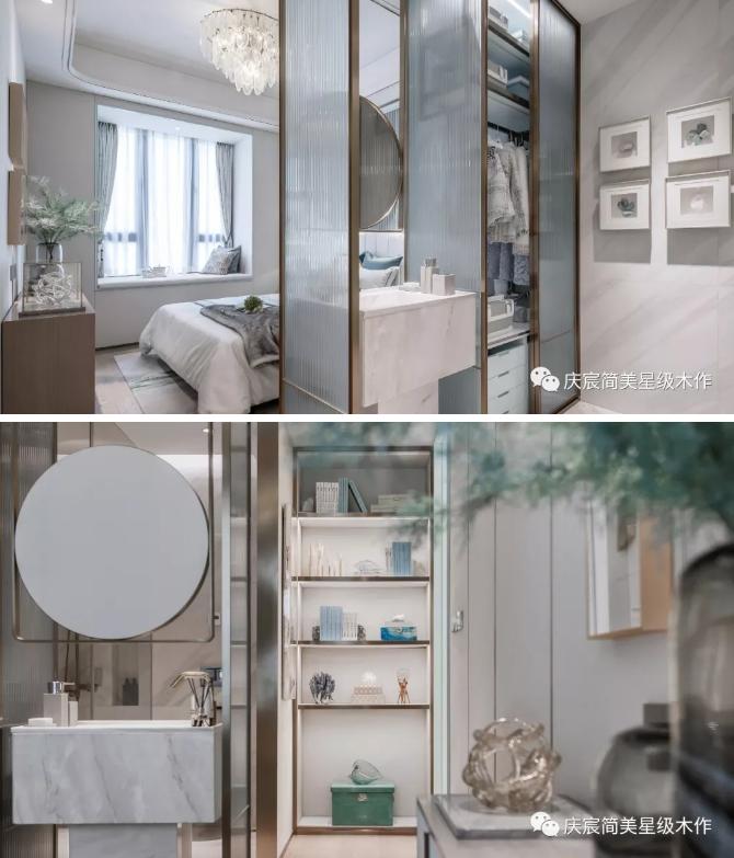 主卧利用步入式衣帽及展示柜。开放式主卧卫生间、衣帽间、女主人的化妆台交叉功能,面积配比不再是局限。蒂芙尼蓝柔和的色彩提升幸福感和归属感。时尚与美学在其中跳跃,惊起一丝慵懒与惬意的波澜,又平添一份惊鸿一瞥的包容。