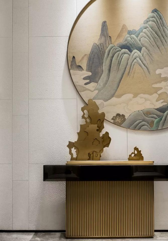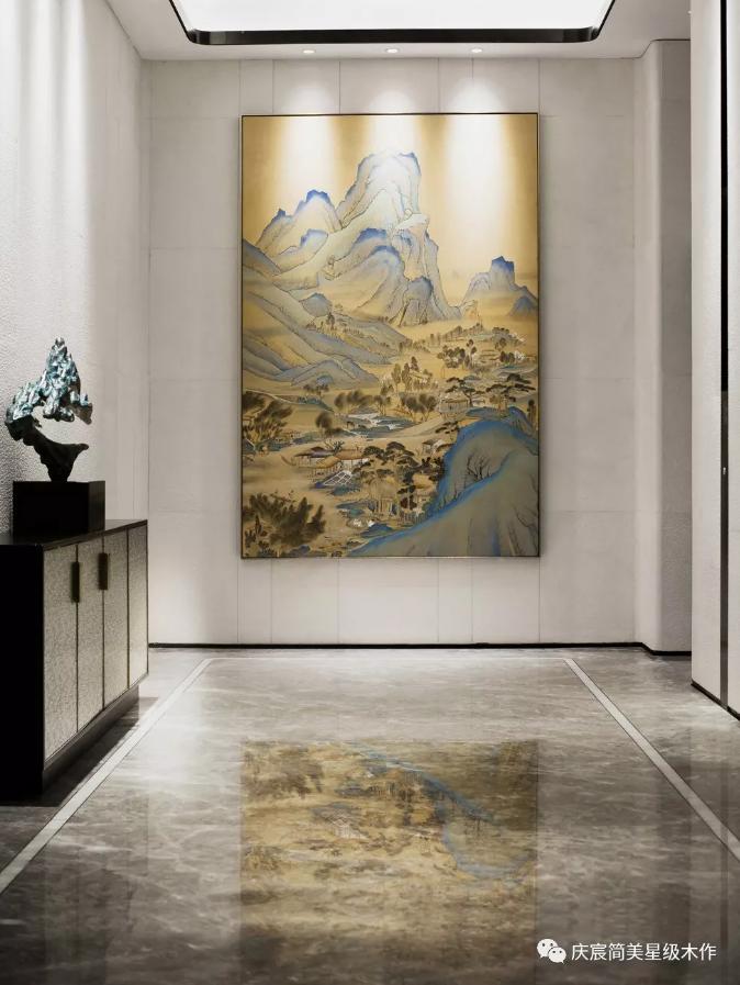 Stepping into the entrance, it is attracted by a gentle rural landscape. The marble floor reflects the beautiful picture, the layers of trees and houses, bringing people to a distant place. On the side table is placed a fine statue, dark green color, simple and exquisite, intriguing.