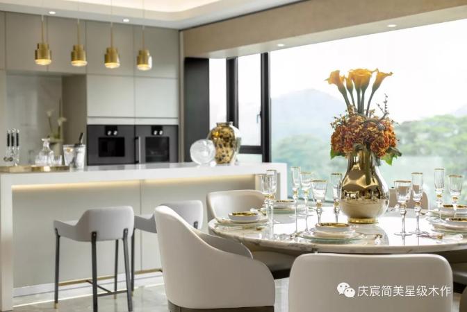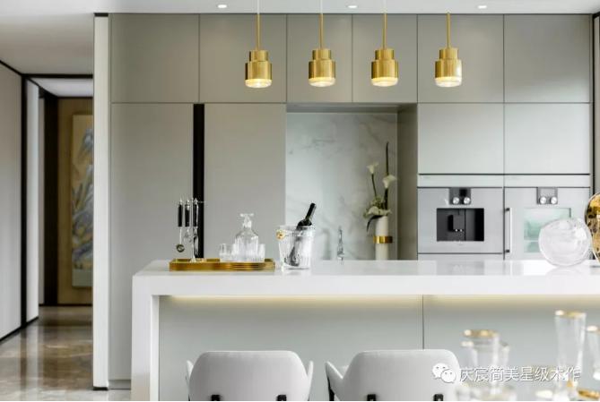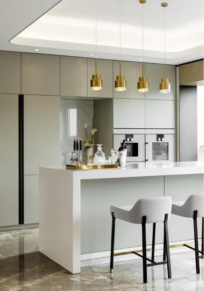 The kitchen is decorated with a row of golden lights, and the neat arrangement is consistent with the smooth and refined line shape. The built-in cabinet has a harmonious and uniform panel and looks pleasing to the eye. The shining marble island is so bright that it has a different mood.