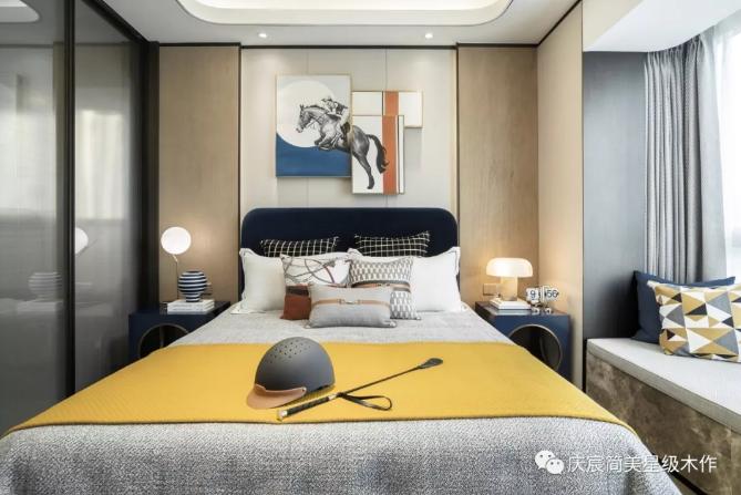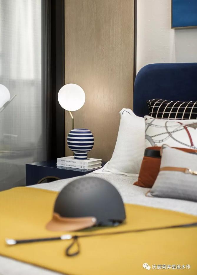 以马术为设计主元素,掺入缤纷多彩的元素,以打造时尚活力的次卧空间。木色饰面,自然温润,深蓝色背靠恰好与中央背景墙相映衬。床边两个小灯盏,灵巧可爱。窗边设了一松软的榻榻米,闲暇时候在此静观外景,让心静下来。