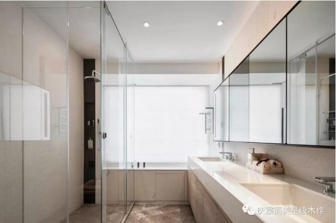 The bathroom tends to be light beige, and the light-transparent glass window introduces a gentle outdoor light. The bathtub is embedded in the brick body, and the integrated double basin forms a bright and refreshing feeling. The gentle finish is lined with flat glass to illuminate every moment of your beauty.