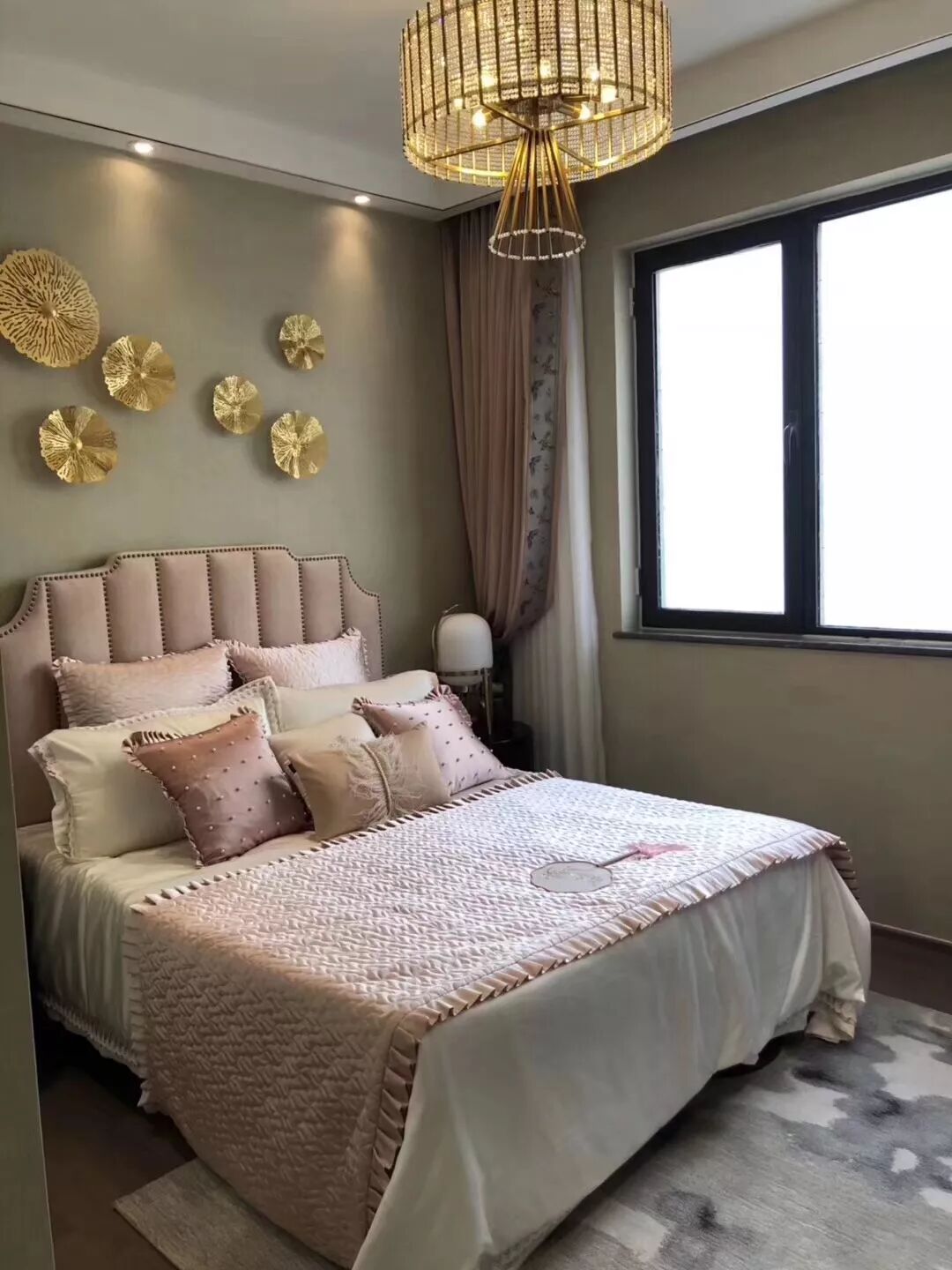灰色为主色调的卧室,经过不太鲜艳的粉色元素粉装,让卧室有一种温馨舒适的感觉,卧室中的金色吊灯与金色装饰相互吸引,为空间带来奢华简洁、唯美大气的层次感,这样的装修非常符合女孩的居住环境。