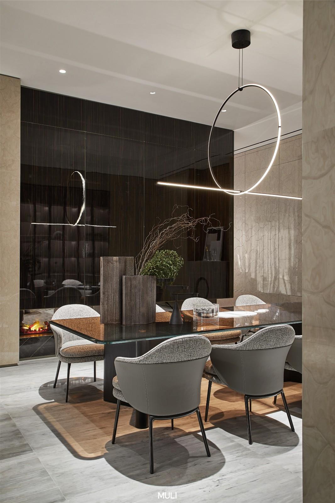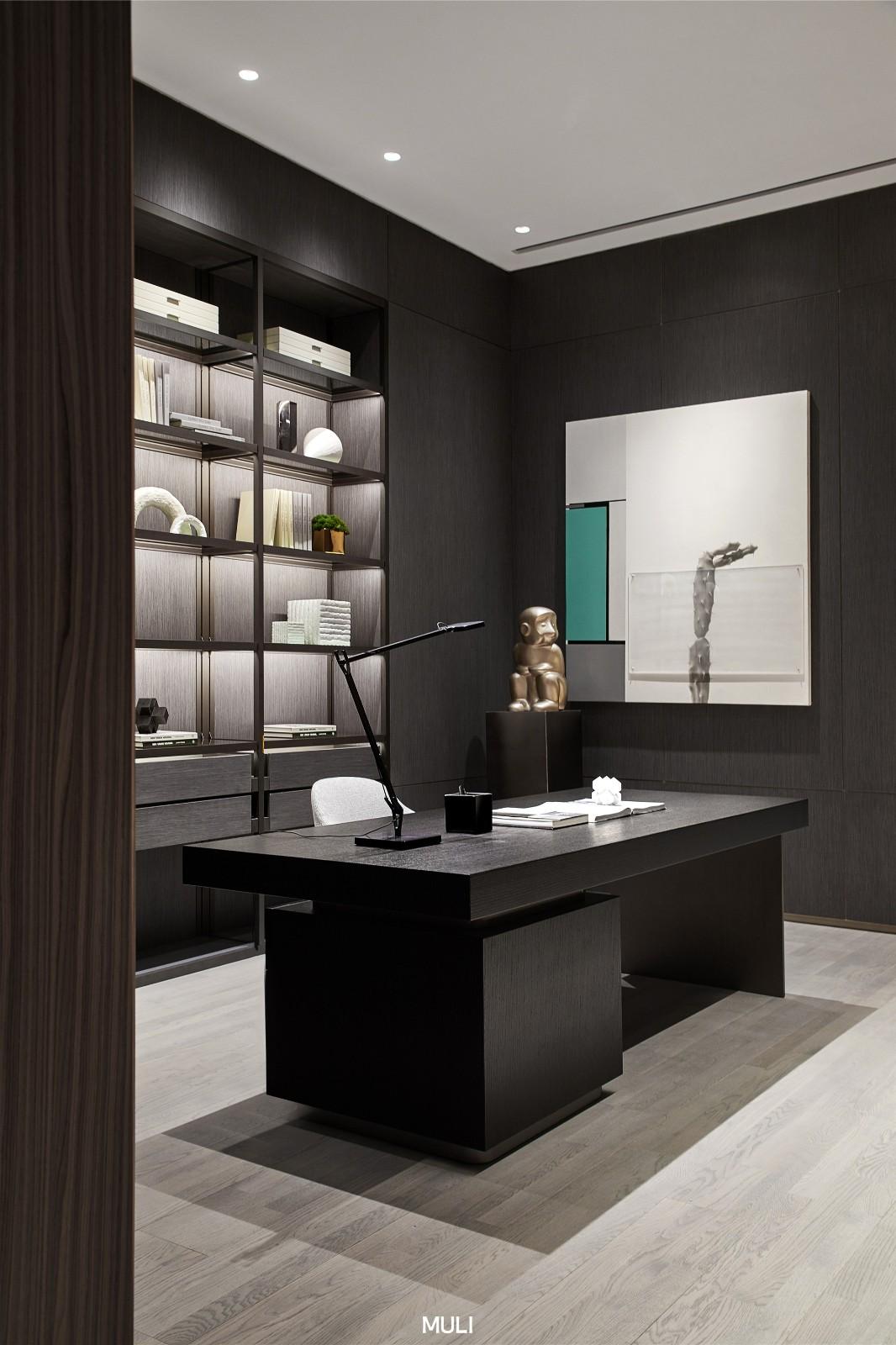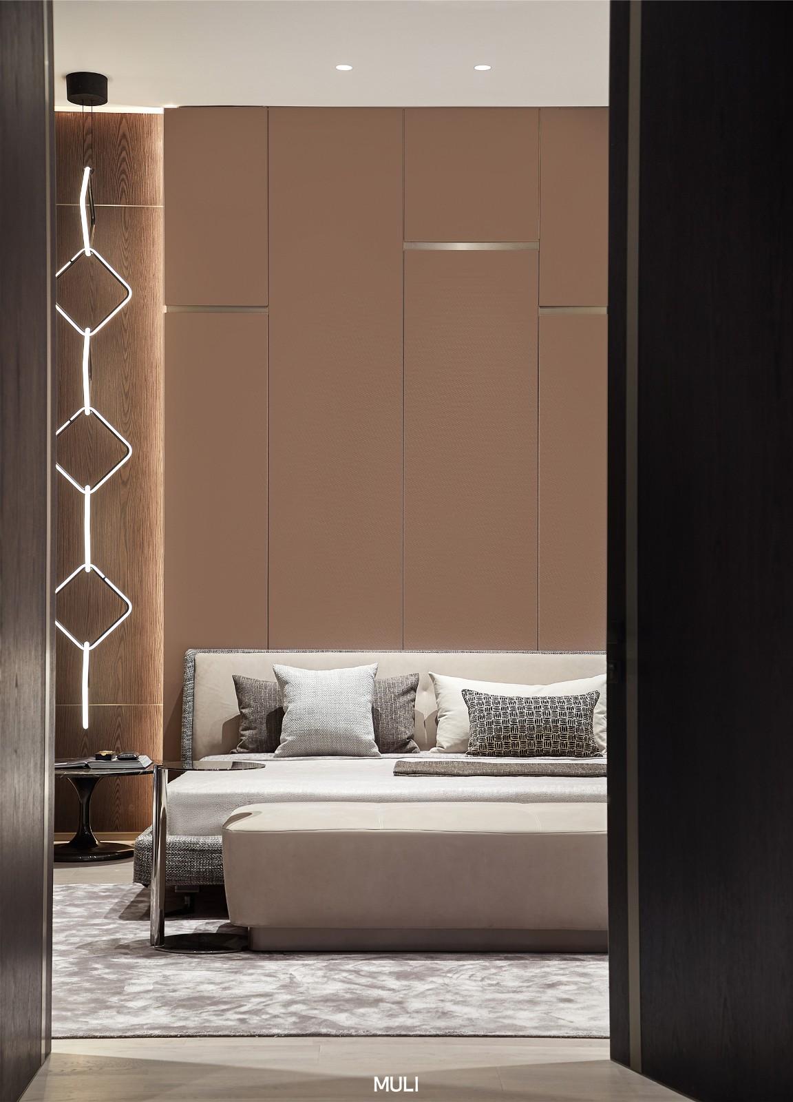 空间以高光浅色为主,奠定明朗、欢快的基调,另一侧用深色点笔,通透又不失沉稳。书房以深色胡桃木为背景,营造出平静的氛围,局部照明与整体配合的恰到好处,光线柔和、稳定有序。半开放的形式,如同一条隐秘的动线,似有若无的指引着日常生活习惯。卧室连接着衣帽间,以浅色为基调,传递出自然、柔和的气息,在皮革中融入中国传统“图纹”设计,激发出现代东方意韵。