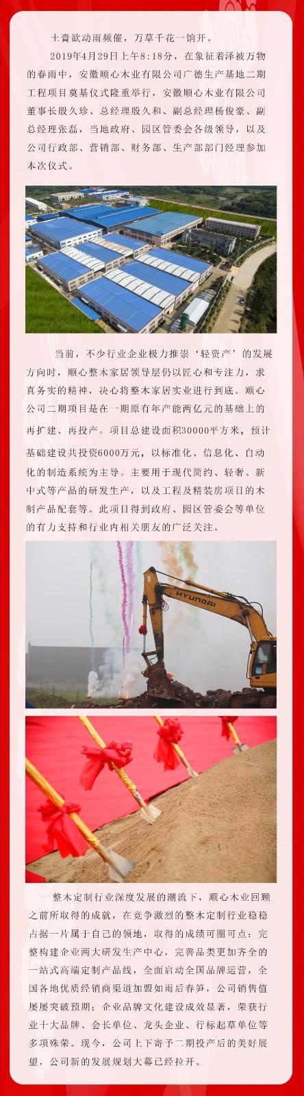 土膏欲动雨频催,万草千花一饷开。2019年4月29日上午8:58分,在象征着万物复苏的春雨中,安徽顺心木业有限公司广德生产基地二期工程项目奠基仪式隆重举行