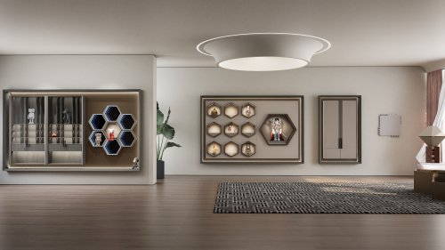 慕士塔格系列的潮玩空间完美诠释了这一哲学,整个柜电集成设计以光为笔,重塑空间视觉焦点。蜂巢柜采用前口六边斜打光方案,使光线从侧前方均匀照亮藏品,消除阴影,令手办的每一处细节都清晰可见。C位手办柜顶部配备专业级磁吸射灯,可根据手办大小自由移动打光位置,实现精准的焦点照明。玻璃门手办柜内部搭配均匀柔和的层板灯带,建立起“主次分明、重点突出”的立体光场;手办墙四周的隐藏式灯带,则以轻盈光晕将整个结构托起,营造悬浮般的视觉体验。让展示,真正成为一种由光雕琢的艺术。