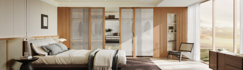 卧室衣帽间采用一体化设计,于玻璃的通透中融入艺术之美,以“浩渺之境”贯穿其中,在时尚中探索自然魅力。壁挂系统极简的开放式设计,服饰一目了然,方便存取,诠释现代高级感。化妆区玻璃门柜可容纳大量的化妆品,配置智能升降吊柜,集高效收纳、便捷取用、视觉美观与智能互动于一体。当起床闹钟响起,智能音箱播放起床音乐的时候,家里自动亮灯,电动窗帘自动打开,早间起床的氛围感顿时拉满,带来了超越想象的智慧生活与幸福感。这种设计让科技不再是冰冷的工具,而成为理解生活、响应需求的智慧伙伴。