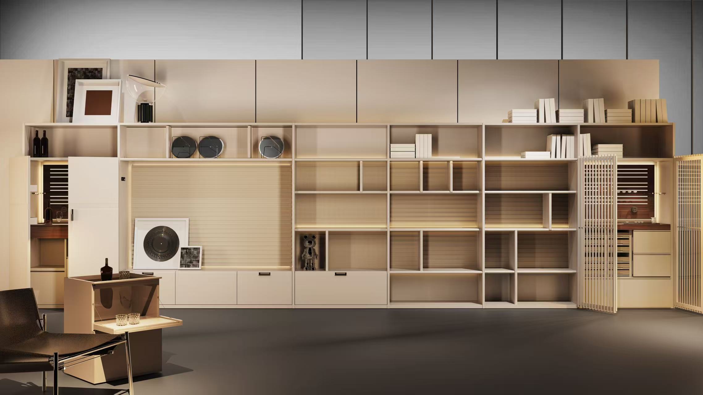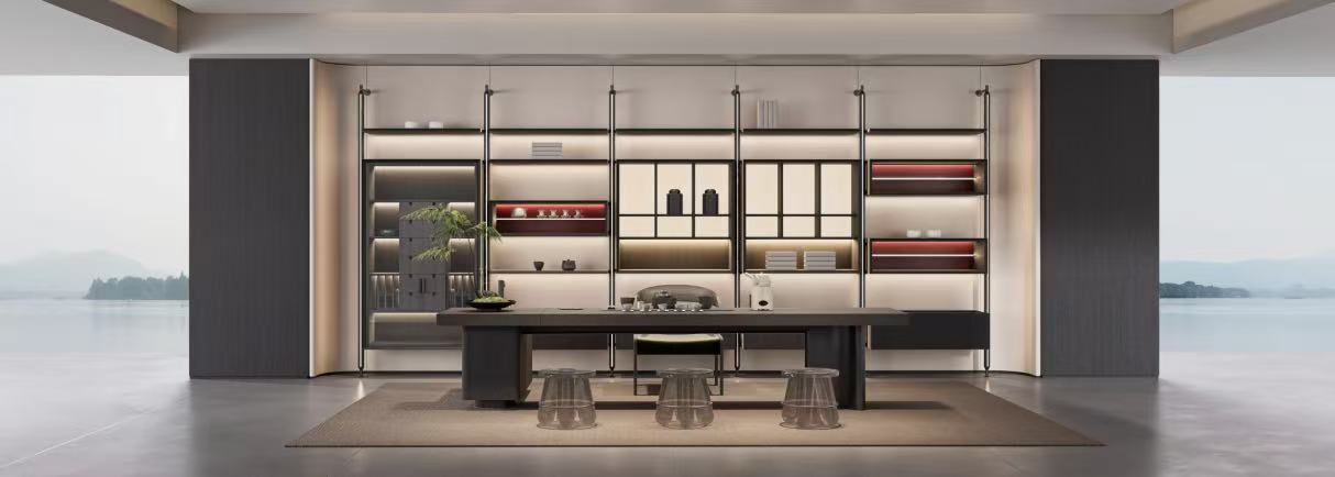 洞庭系列的茶室是整个产品系列的核心空间之一,用出色的产品表现深度诠释“茶禅一味”的东方生活哲学。它超越了一个品茶角落,成为一个融合了文化修习、亲子互动、商务洽淡乃至个人冥想的复合型精神场域。叠浪茶柜、修竹立柱、翻盖茶舱搭配灯光系统、潮汐茶台的开合式设计,特别是“茶山有泉”功能,集成母婴级净水器,自动上水且多档恒温,完美诠释了“七分在水,三分在茶”的茶道精髓。这一场景化的茶空间解决方案,重新定义了“第三空间”在家居中的标准,为行业提供了将重度爱好场景深度、优雅融入日常生活的范本。