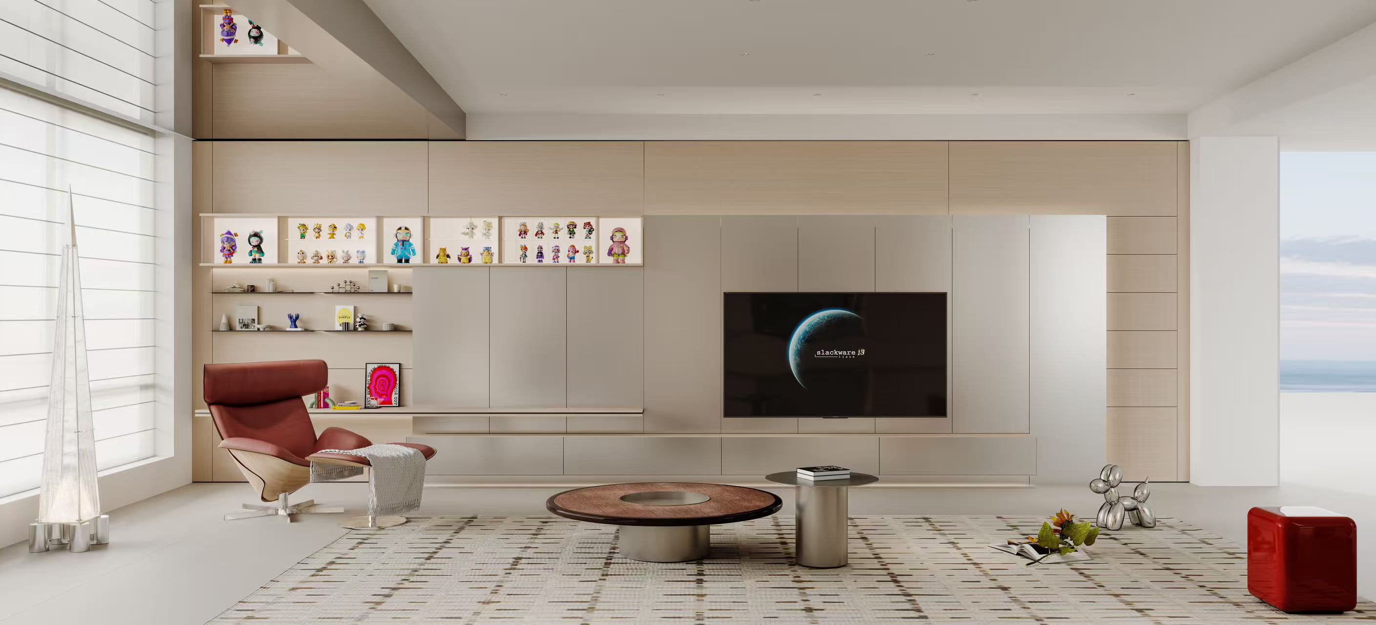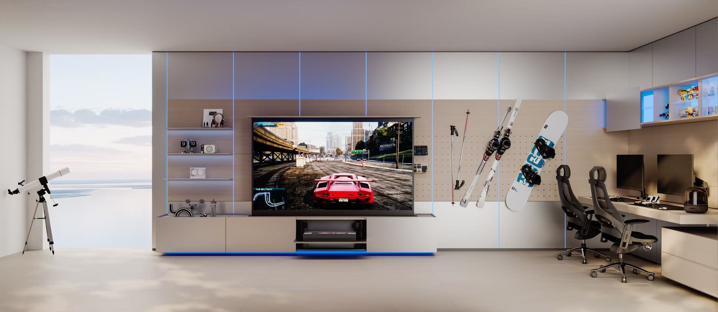 艾尔系列多功能房完全长在Z世代的“心巴”上,它将电竞战场的激情、私人影院的沉浸与潮玩收藏的个性完美融合,打造出一个触手可及的“次元基地”。在这里,光线被赋予了情绪与智慧——立体灯光系统如同一个庞大的情绪画板,可自由随心调配氛围配方。无论是多巴胺背板的元气迸发,还是深渊镜柜灯带的迷幻律动,色彩皆能随音乐实时跳动。整个空间瞬间化为一个包裹感官的“声光结界”,只需一首歌的时间,便能将疲惫与焦虑清零,快速完成状态重启,时刻为灵感与活力充电。