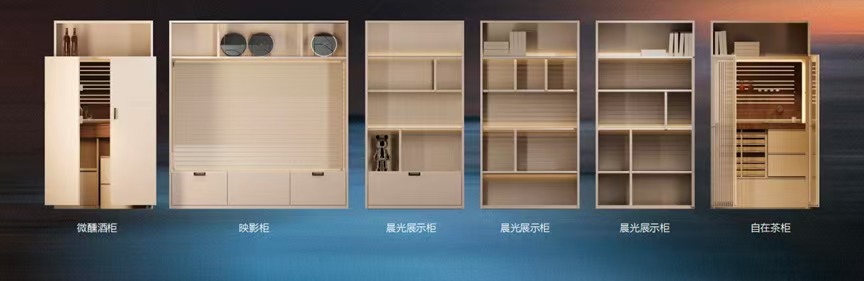 班迪系列则以Link System为核心,带动客厅与餐厅空间的场景革新。“客厅·汇屿”如同班迪尔湖中的“静湖岛屿”,该空间通过不同柜体组合,可衔接酒柜、茶柜、儿童柜等多种功能模块,配合律动灯带与激光投影设备,可以像乐高一样自由重组、无限扩展,实现办公、观影、社交等场景的一键切换。Link System将餐边柜升级为智慧生活枢纽,集成微醺酒柜、晨光咖啡角等四大模块,模糊了餐与休闲的界限。它回应了年轻一代“流动的身份”与“多线程生活”的本质需求,让家成为一个能够持续“更新版本”的活统。