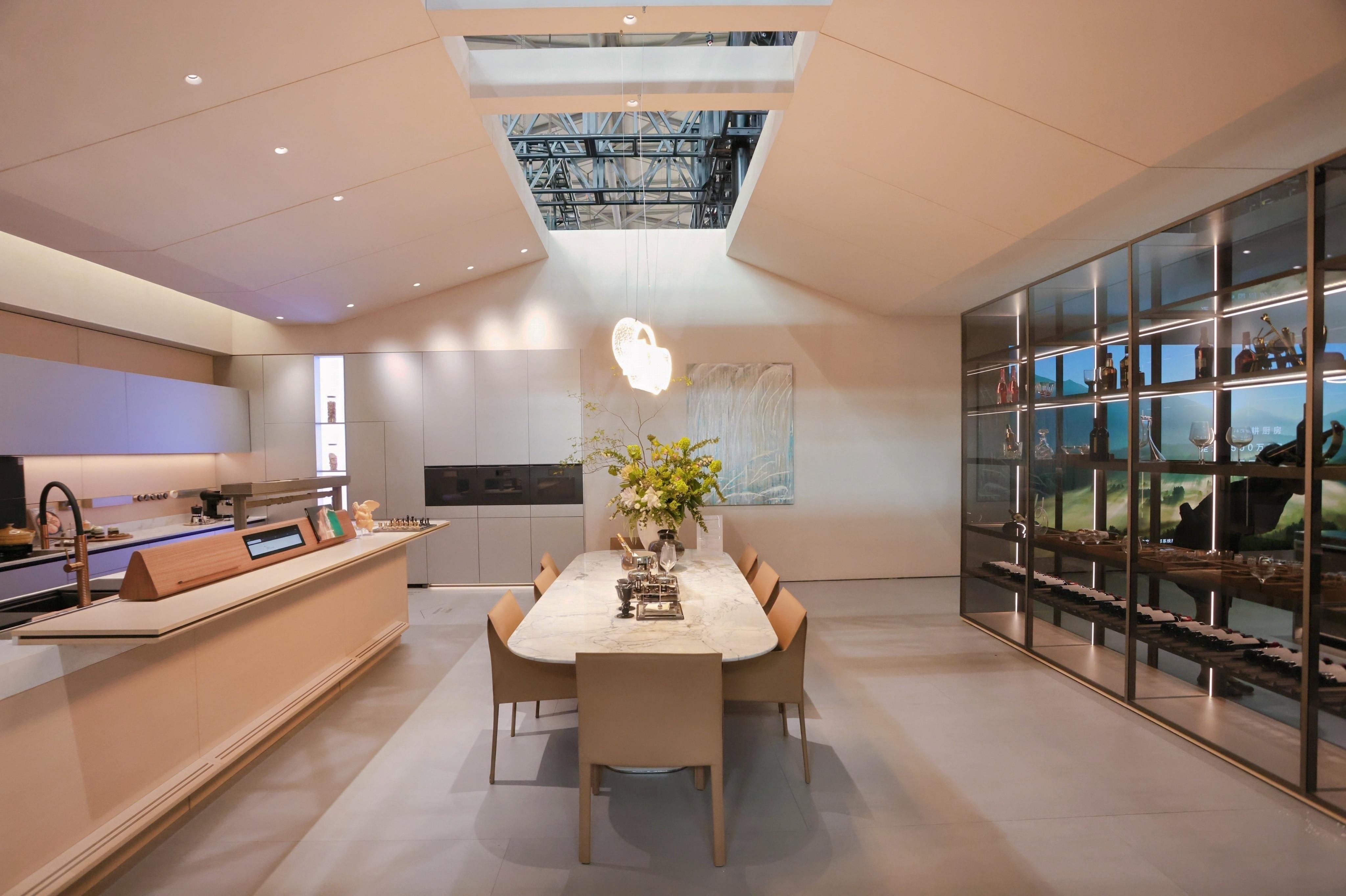 厨房空间配备最新方太智慧厨电,包括烟、灶、蒸、烤、洗、储等,电器功能模块完美嵌入,与柜体融合为一体;中岛搭配智能升降工具收纳系统,备餐时自动升起,随手拿取刀叉调料等,就餐后悄然隐身,还原台面的整洁有序。尤其是方太嵌入式冰箱,冰箱门与厨房高柜门板的同色设计,带来极简美观的视觉盛宴。