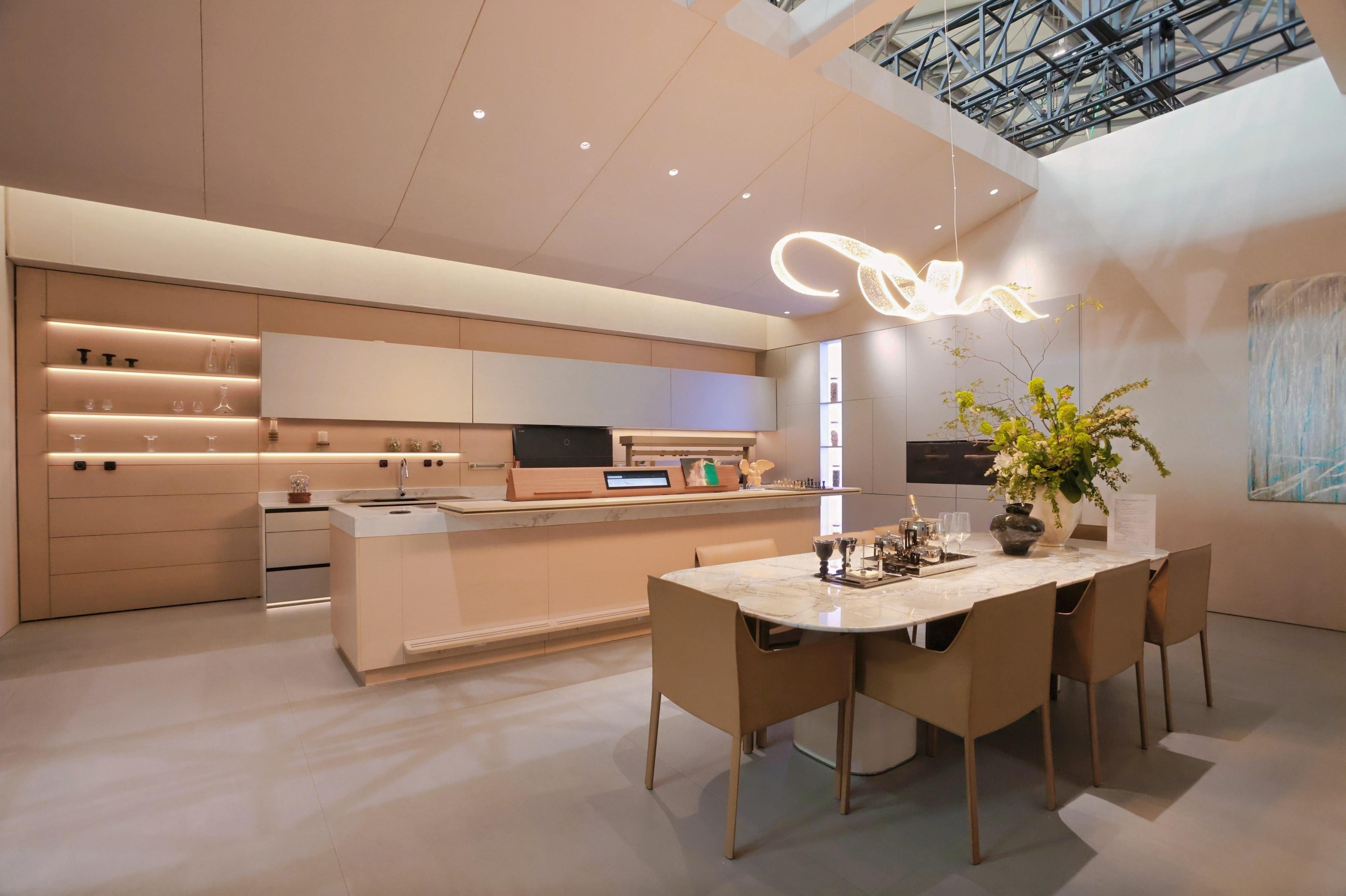 而厨房空间也不再是一个人的兵荒马乱。一键开启“炊宴模式”:操作区灯光聚焦增亮,洗切烹煮清晰顺手;RGB背板灯随烟火气息律动,烟机与设备自动开启,无需分心操作。水吧与客厅同步柔光,朋友聊天取饮,主人在灶台前也能随时融入对话——烹饪从未如此从容。