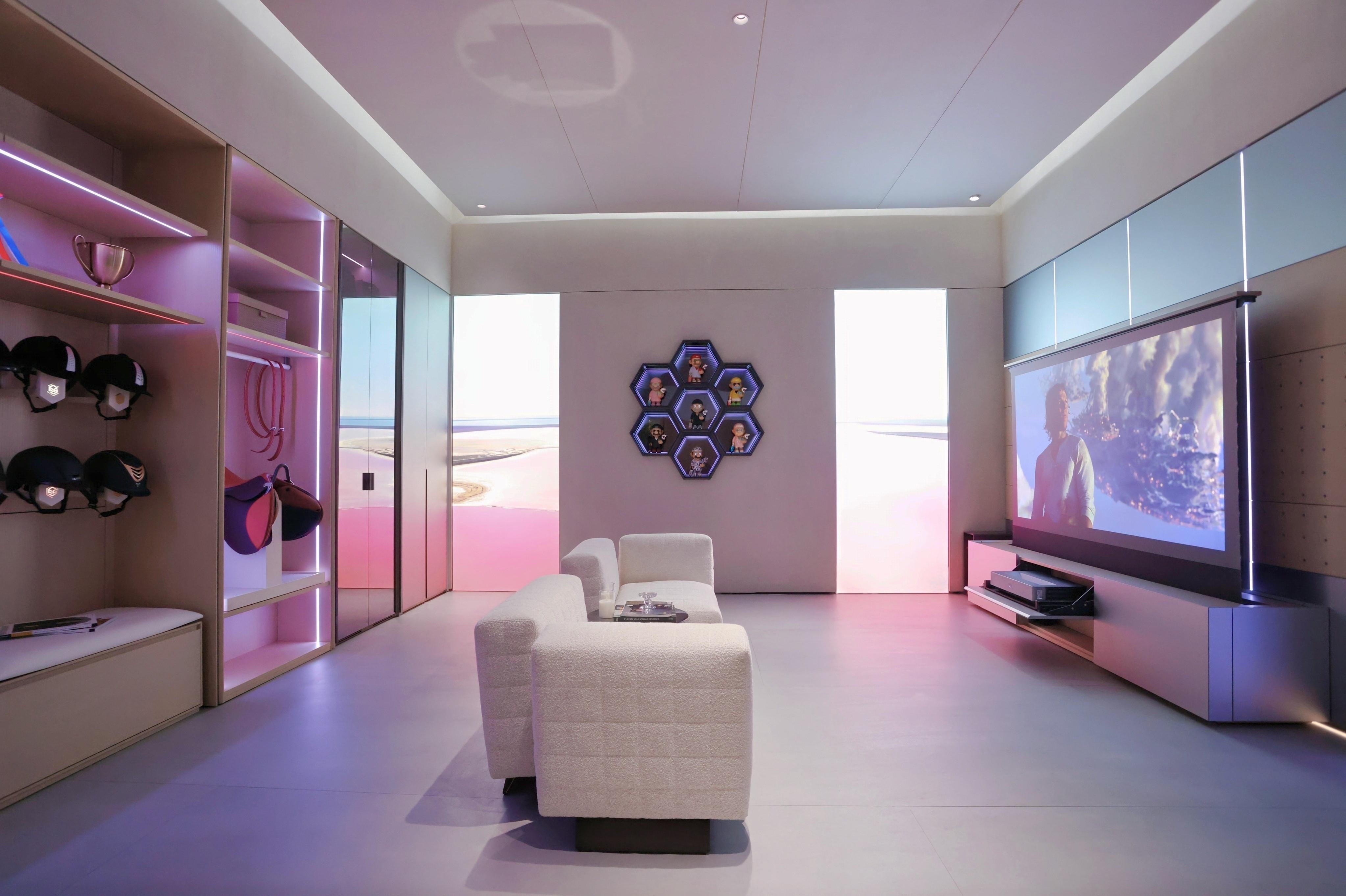 空间配色上,还原干枯季艾尔湖盐滩的银装素裹的“晶湖银”、捕捉金色霞光倒映湖面的温暖治愈“霞湖金”、从水岸交织的麦田中提取层次与暖意“阡陌织麦”三大主色共同构建起一套“视觉降噪”系统,为过度刺激的视网膜按下暂停键。而与这“一静”色彩呈现相对的,是“一动”的空间情绪张力。当想“嗨”的时候,多巴胺发光背板亮起,整个空间被注入年轻、时尚、趣味的生命力,色彩无极调控,无视觉暗区,可随音乐律动变幻,仿佛多巴胺的分泌,整个房间都在跟着情绪走,想燃就燃,想炸就炸。