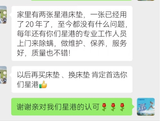 1997年,星港首推“呵护八年,关怀永远”的主动质量跟踪服务,受到消费者的广泛好评。2014年,为延续这一服务理念,星港家居再次升级售后服务质量,推出寝具护理大行动,引进先进技术,在服务模式上不断探索创新,全方位对床垫进行清洁、除螨、防护,至今已为数万家庭带去了健康睡眠。