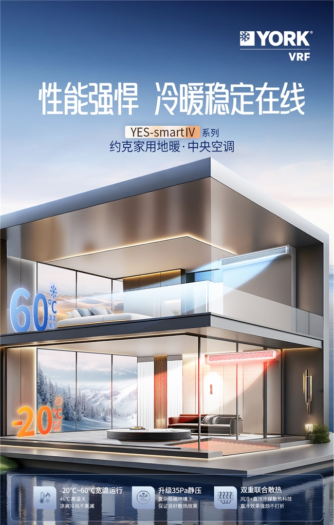 从寒冬到酷暑,从花粉漫天的春日到干燥多风的深秋,约克VRF中央空调YES-smart IV系列用科技的温度,熨平了四季的褶皱。它不只是一台中央空调,更是家的“舒适调节器”,让每个季节的轮转,都能成为家的美好注脚。