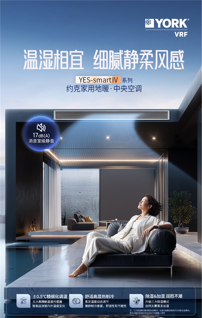 当清晨的阳光掠过窗台,你是否渴望深吸一口清新的空气?当梅雨季的潮湿爬上墙壁,你是否厌烦了衣物永远晾不干的黏腻?当深夜的空调冷风直吹床头,你是否总在半梦半醒间裹紧被子?约克VRF中央空调YES-smart IV系列新品上市,水氟合一、自由组合,将舒适家的设计权交付于你,不止是调节温度的机器,更像一位懂生活的伙伴。