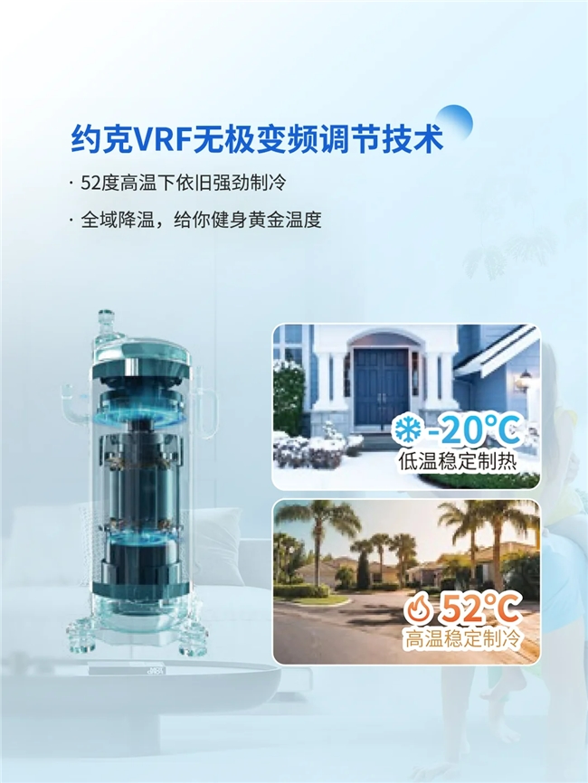 高温酷暑与极端低温天气交替,对空调的稳定运行是极大考验。约克VRF中央空调采用约克品牌热泵采暖专用喷气增焓压缩机,搭载无级变频技术,实现-20-52℃宽温运行,动力强劲、运行稳定。无论是40℃的炎夏,还是寒潮来袭的冬日,都能稳定输出强劲动力,保障制冷制热效果。