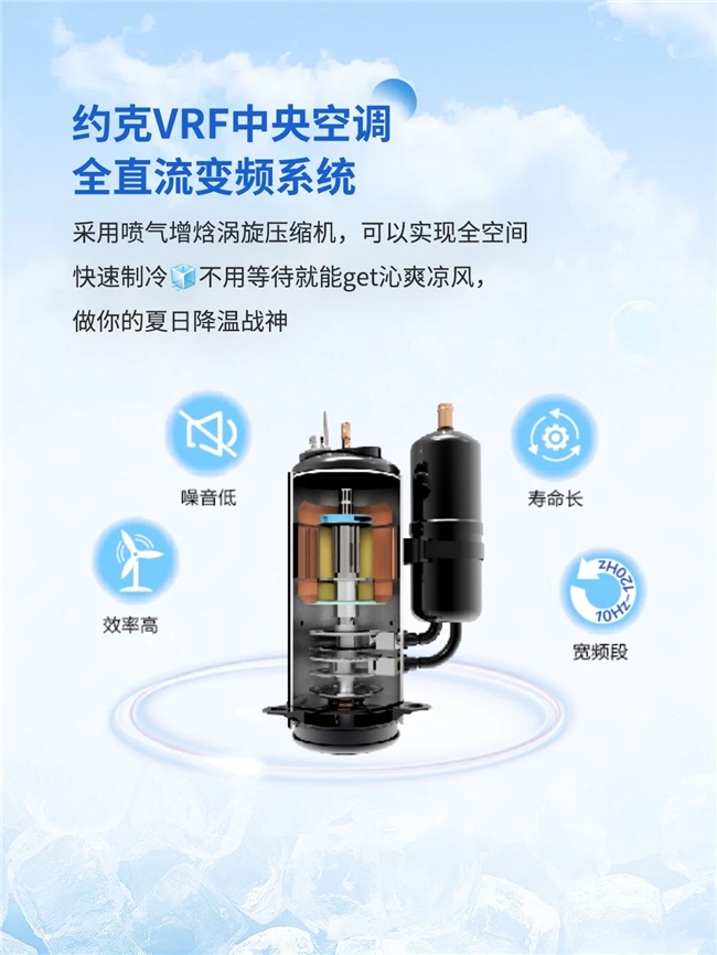 暑假尾声,天气仍有“小脾气”——白天可能依旧炎热,需要强劲制冷;遇到降雨降温,又需快速升温保持舒适。约克VRF中央空调全直流变频系统搭载约克品牌热泵采暖专用喷气增焓压缩机,配合无级变频技术,实现-20-52℃宽温运行,无论外界温度如何波动,都能稳定输出冷热动力。
