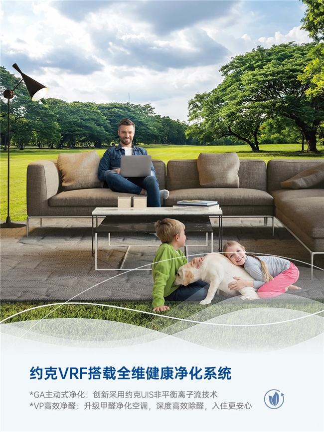 暑假里家人居家时间长,室内空气品质至关重要。约克VRF中央空调搭载全维健康净化系统,从空气净化到新风引入,构建全方面健康防护:GA主动式净化技术创新采用约克UIS非平衡离子流技术,空调出风时释放大量活性氧离子,主动捕捉病毒细菌、悬浮颗粒物等,抑菌消毒、降尘除霾、消苯除醛;VP高效除醛滤网技术升级甲醛净化空调,使净醛黑科技大风量、高循环优势结合,可强力去除装修残留甲醛,1小时甲醛去除率达99%;银离子抑菌模块可抑制接水盘内霉菌滋生,维持室内健康环境;智能自清洁功能一键深度清洗换热器脏污,省时省力,源头吹出洁净风。
