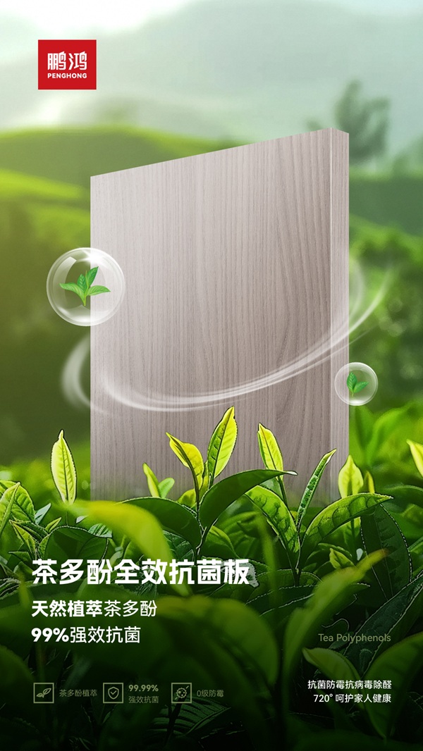 经权威检测,该板材对金黄色葡萄球菌、大肠杆菌等日常菌种的抗菌率达99.99%,防霉等级为0级,对部分病毒也具有99%灭活能力。茶多酚经美国FDA认可为安全物质,鹏鸿通过高科技工艺将其植入饰面,无毒无害,适合家庭长期使用。